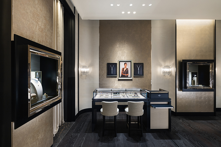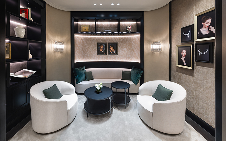 เมื่อเดินลึกเข้าสู่พื้นที่ด้านใน แขกจะพบกับสองห้องรับรองที่ได้รับการออกแบบเพื่อมอบประสบการณ์ส่วนตัวในการชมเครื่องประดับ ภายใต้แสงไฟที่นุ่มนวลและวัสดุคุณภาพสูง บรรยากาศในแต่ละห้องสื่อถึงความสง่างามแบบฝรั่งเศสที่กลมกลืนกับความอบอุ่นแบบไทย มอบพื้นที่ให้แขกได้สัมผัสและค้นพบคอลเลกชันอัญมณีชั้นสูง เครื่องประดับอันเป็นเอกลักษณ์ และเรือนเวลาล้ำค่า