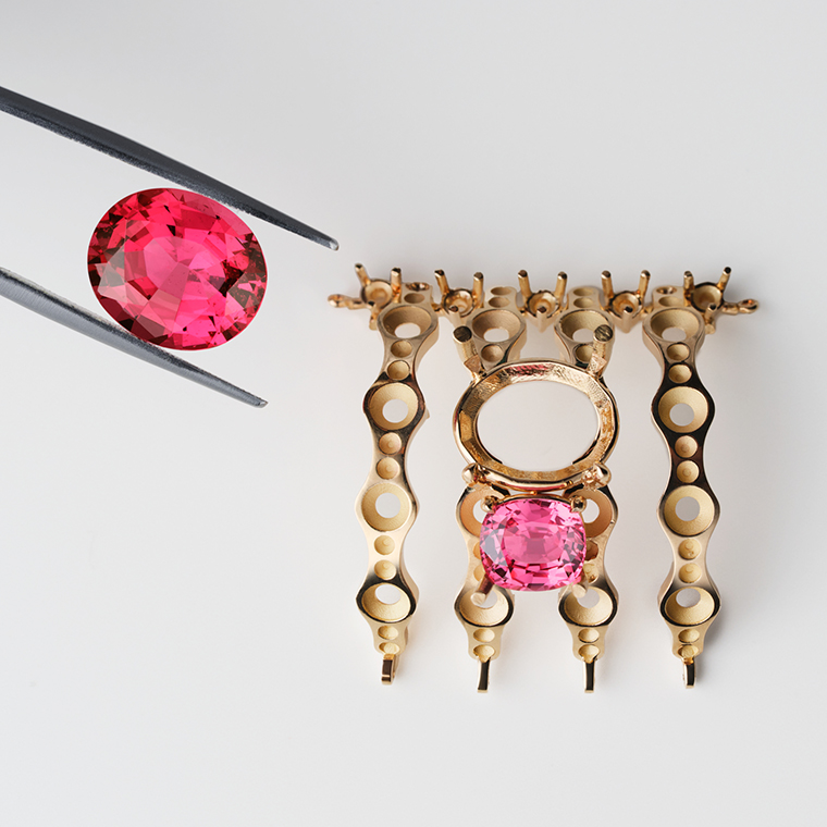 สปิเนลสีแดงและสีชมพูอมส้มอันหายาก ที่งดงามโดดเด่นเป็นจุดศูนย์กลางของเครื่องประดับชุด Wave Illusion