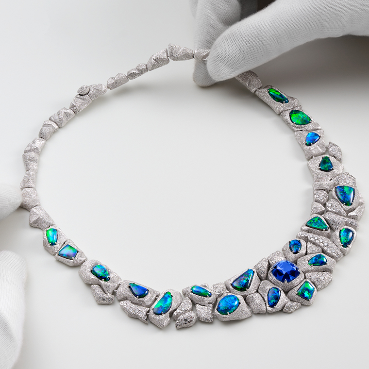 ในลวดลาย Decor Palace พร้อมด้วยกิ่งก้านของโครงสร้างโมบายที่แผ่ขยายออก ซึ่งแต่ละกิ่งประดับด้วยหินล้ำค่าที่มีรูปร่างตามธรรมชาติในเฉดสีน้ำเงินและเขียว เพื่อให้สะท้อนแสงวาบของโอปอลสีดำ