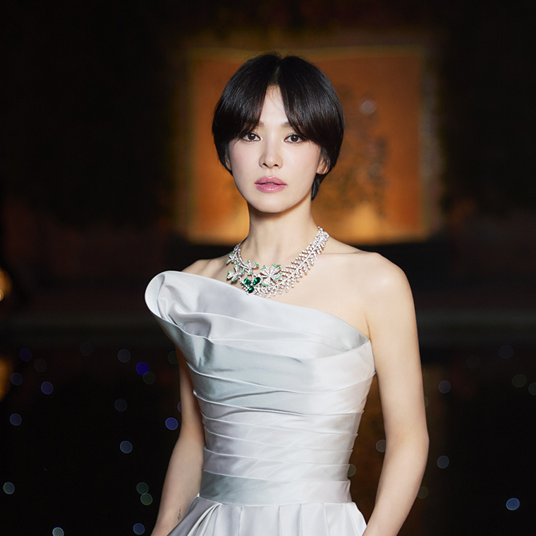 นักแสดงสาวชาวเกาหลี Song Hye Kyo แอมบาสเดอร์ของแบรนด์ปรากฏตัวในลุคอันเปล่งประกายด้วยสร้อยคอ Cloverand Fern จากคอลเลกชัน Jewels by Nature สรรค์สร้างจากทองคำขาวที่รังสรรค์อย่างประณีตประดับด้วยมรกตทรงหยดน้ำจากโคลอมเบียสามเม็ดน้ำหนัก 4.62, 4.23 และ 2.76 กะรัต ถ่ายทอดความงดงามของธรรมชาติผ่านดีไซน์ที่อ่อนช้อยและเปี่ยมด้วยเอกลักษณ์