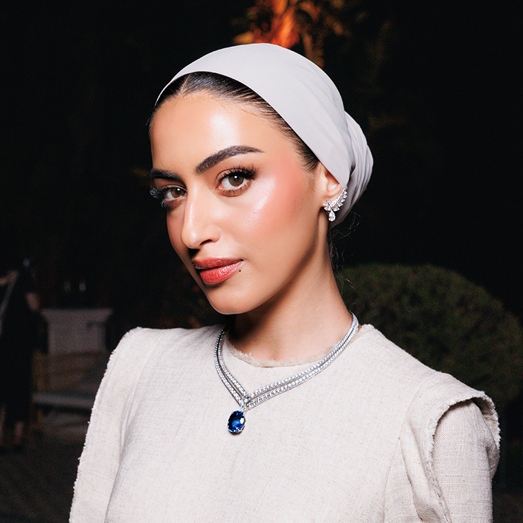 Yara Al Namlah นักธุรกิจสาวชาวซาอุดีอาระเบียและ friend of the Maison สวมใส่สร้อยคอ Joséphine Éclat Floral ออกแบบด้วยทองคำขาวประดับด้วยแซฟไฟร์ทรงไข่จากศรีลังกา (Ceylon) น้ำหนัก 31.25 กะรัต พร้อมด้วยต่างหูทองคำขาวที่เข้าชุดกันประดับแซฟไฟร์ทรงหยดน้ำสองเม็ดน้ำหนักประมาณ 3 กะรัต ต่อเม็ดถ่ายทอดความงดงามและความสง่างามอย่างลงตัว