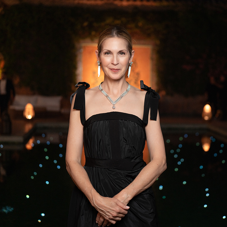 นักแสดงหญิงชาวอเมริกัน Kelly Ruther ford สวมใส่สร้อยคอรุ่น Voltige ที่ดีไซน์จากทองคำขาวประดับด้วยเพชรทรงไข่น้ำหนัก 10.18 กะรัต และเพชรเจียระไนทรงกลมพร้อมด้วยต่างหูแบบแปลงรูปได้จากทองคำขาวประดับเพชรทรงไข่สองเม็ดน้าหนัก 2.54 และ 2.51 กะรัตตามลาดับจากคอลเลกชันไฮจิวเวลรี่ Chaumeten Scène