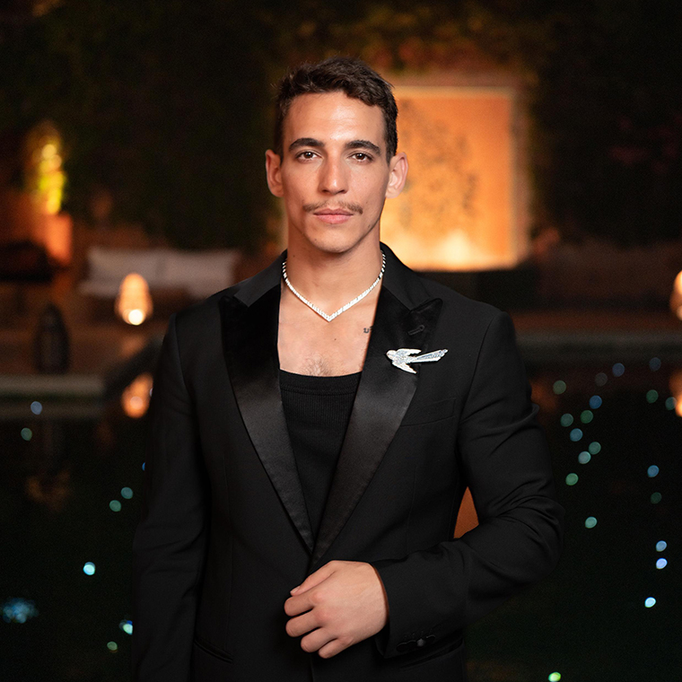นักแสดงชาวสเปน Miguel Herrán เลือกสวมสร้อยคอทองคาขาวประดับเพชรจากคอลเลกชัน Joséphine Aigrette รวมทั้งหมด 2.53 กะรัต พร้อมด้วยเข็มกลัด Grandiflora จากคอลเลกชันไฮจิวเวลรี่ Jewels by Nature