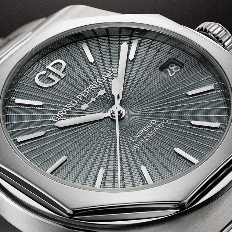ด้วยความบางเฉียบของตัวเรือนและสายนาฬิกา ผลงาน Laureato โดดเด่นในเรื่องของความสบายเวลาสวมใส่ พร้อมกับสไตล์คลาสสิก เข็มบอกชั่วโมงและนาทีเคลือบโรเดียมทรงบาตอง ขณะที่เข็มวินาทีทรงเพรียวบางตรงกลางประดับตุ้มน้ำหนักซึ่งได้รับแรงบันดาลใจจากสะพานจักรกลทองคำอันเป็นเอกลักษณ์ของ Girard-Perregaux เป็นการรำลึกถึงรากฐานแห่งศาสตร์ของเครื่องบอกเวลา ช่องหน้าต่างแสดงวันที่ในตำแหน่ง 3 นาฬิกา ได้รับการออกแบบด้วยตัวเลขสีขาวบนแผ่นดิสก์ที่มีสีเดียวกันกับพื้นหน้าปัด
