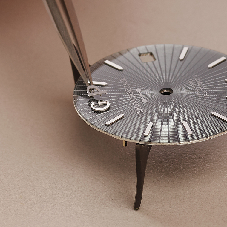 จุดเด่นของนาฬิกาเรือนนี้คือพื้นหน้าปัดที่นำเสนอความประณีต โดดเด่นด้วยเฉดสีน้ำเงินอมฟ้า หน้าปัดนี้ได้รับการสร้างสรรค์จากเทคนิคอีนาเมลกรองเฟอ ซึ่งผลิตขึ้นอย่างพิถีพิถันภายในโรงงานของกลุ่มบริษัท Sowind Group อันเป็นเครือบริษัทเดียวกับ Girard-Perregaux กระบวนการศิลปะชั้นสูงนี้สะท้อนให้เห็นถึงความมุ่งมั่นของ Girard-Perregaux ในการรักษามาตรฐานแห่งงานฝีมือชั้นสูง