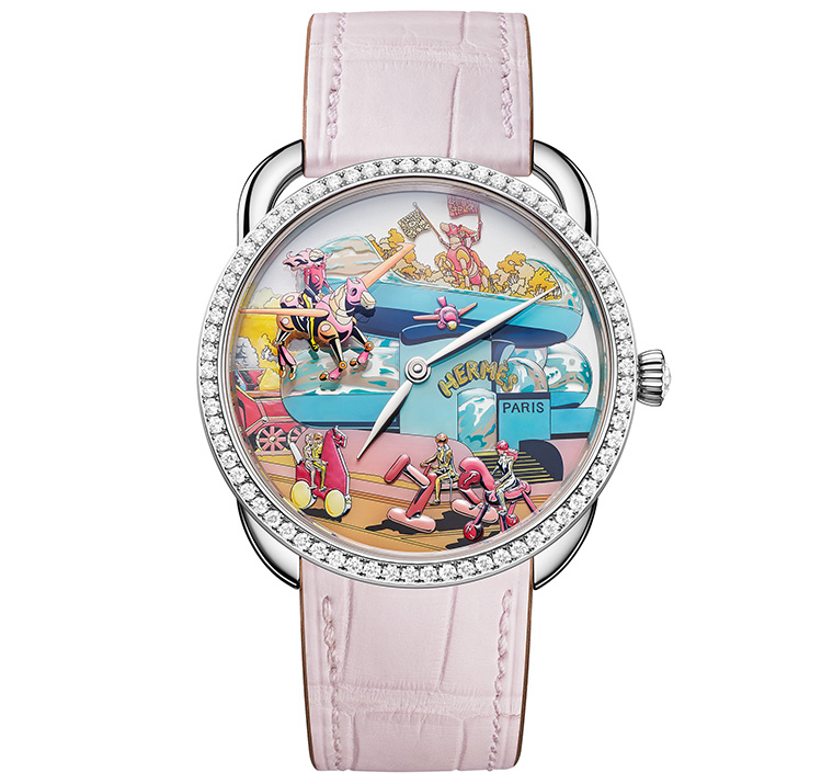 บนหน้าปัดของนาฬิกา อาร์โซ แอร์เมส โลโคโมชั่น นี้ประกอบด้วยชั้นต่าง ๆ ของเทคนิคการวาดภาพที่หลากหลาย นับจากการเคลือบชั้นแรกที่สร้างรูปเป็นฐานบนงานออกแบบ และรายละเอียดอันพิถีพิถันซึ่งถูกเผยขึ้นโดยการใช้แต่ละสีสันต่าง ๆ ที่ได้รับแรงบันดาลใจมาจากแถบสีของเฉดชมพู เหลือง ฟ้า และเขียว จากนั้น ชั้นที่สองจึงถูกนำมาบรรจงวาดลงบนด้านใต้ของกระจกคริสตัลแซฟไฟร์ที่ครอบคลุมอยู่เหนือหน้าปัดเพื่อการปกป้อง เน้นย้ำให้เห็นถึงมุมมองหลากหลายมิติเสมือนกับภาพสามมิติแบบย่อส่วน และ ณ ศูนย์กลางของภาพยังติดตั้งไว้ด้วยเข็มชี้สไตล์ใบไม้โทนสีเงินสองเข็มที่ทำหน้าที่แสดงเวลาชั่วโมงและนาทีได้อย่างแนบเนียน ขับเคลื่อนเวลาโดยการทำงานของกลไกจักรกลไขลานอัตโนมัติ แมนูแฟคเจอร์ เอช1912 (Manufacture H1912) ที่บรรจุภายในตัวเรือนไวท์โกลด์ขนาดเส้นผ่านศูนย์กลาง 38 มม. โดยรังสรรค์ขึ้นภายในห้องปฏิบัติการ แอร์เมส ออร์โลเฌอร์ (Hermès Horloger) ที่เรือนเวลานี้จับคู่อย่างลงตัวมาพร้อมกับสายหนังจระเข้สีม่วงอ่อน เน้นถึงความโดดเด่นของโทนสีอันประณีตวิจิตรของนาฬิกาที่ผลิตขึ้นในจำนวนจำกัดเพียง 12 เรือน