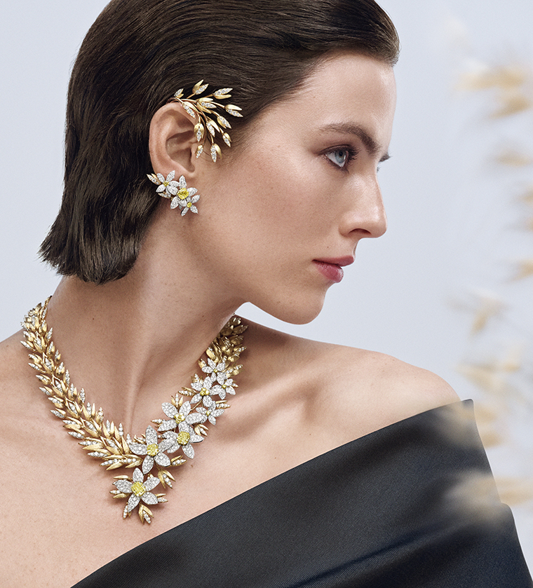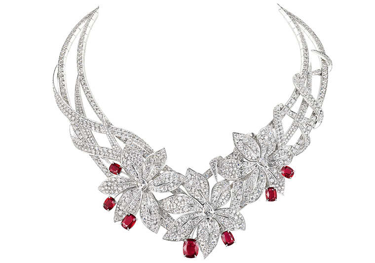 สร้อยคอสุดวิจิตรที่ใช้เวลาสร้างสรรค์มากกว่า 1,500 ชั่วโมง ดอกไม้สามดอกถูกถอดออกจากก้านและประดับอยู่เรียงรายตามแนวลาคอลวดลายเพชรที่เลื้อยเป็นเถาอย่างประณีตรอบแนวคอสะท้อนภาพธรรมชาติพันเกี่ยวที่ Chaumet ถ่ายทอดอย่างงดงามและเป็นเอกลักษณ์เสมอมา