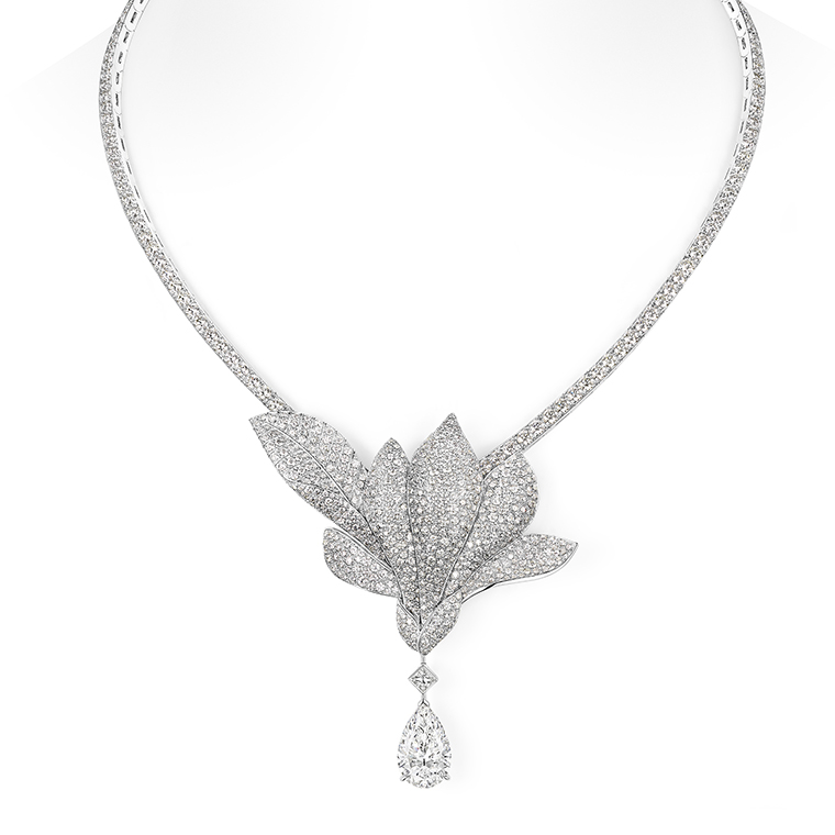 สื่อถึงภาพพรรณไม้ในมิติที่ชัดเจนดอกแมกโนเลียที่ประดับอยู่บนสร้อยคอที่เรียบละมุนโดดเด่นด้วยเพชรหยดน้า DFL type-IIa ขนาด 5.26 กะรัตที่ห้อยประดับอยู่กลางชิ้นงานซึ่งเป็นผลลัพธ์ของกระบวนการรังสรรค์อันประณีตที่กินเวลายาวนานเกือบ 1,150 ชั่วโมงดอกแมกโนเลียที่บานสะพรั่งบนเทียร่าอันเป็นเอกลักษณ์ของ Chaumet ได้รับการตีความขึ้นใหม่ในสไตล์ร่วมสมัยรังสรรค์ใด้วยเทคนิค Pavé ทั้งด้านในและด้านนอกด้วยลวดลายดอกไม้ที่ประดับอยู่ด้านข้างค่อยๆ คลี่ออกสู่เพชรรูปทรงหยดน้าขนาด 2.02 กะรัตซึ่งถูกออกแบบมาให้สะท้อนความอ่อนช้อยไม่สมมาตรคล้ายผ้าโผกศีรษะเวลาสวมใส่