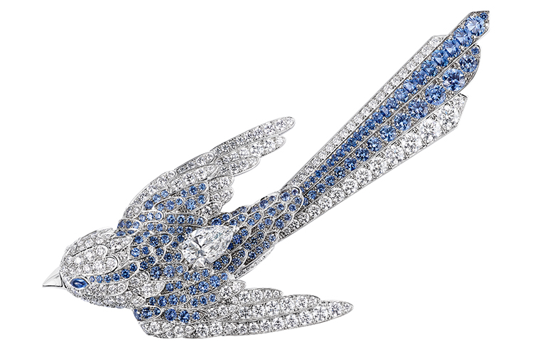 อีกทั้งยังมีเข็มกลัดรูปนกติ๊ดสีน้ำเงิน (Blue Tit) สะท้อนถึงความชานาญของช่างฝีมือที่ศึกษาลวดลายขนนกอย่างละเอียด ถ่ายทอดสีสันของปีกที่กางออกได้อย่างประณีตด้วยเส้นสายของขนนกที่ประดับด้วยการฝังแบบ Grain-Set นกตัวนี้ถูกออกแบบในอิริยาบทที่กาลังโบยบินกลางผืนฟ้าสีครามเผยให้เห็นเพชรทรงหยดน้ำขนาดหนึ่งกะรัตที่ซ่อนอยู่ภายใต้ขนที่นุ่มละมุนอย่างแยบยล 27