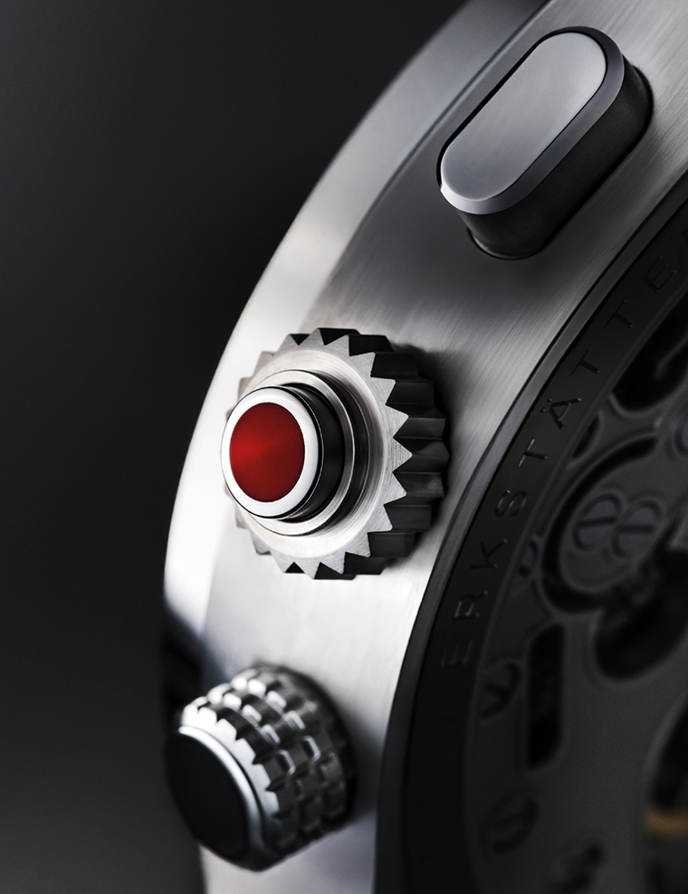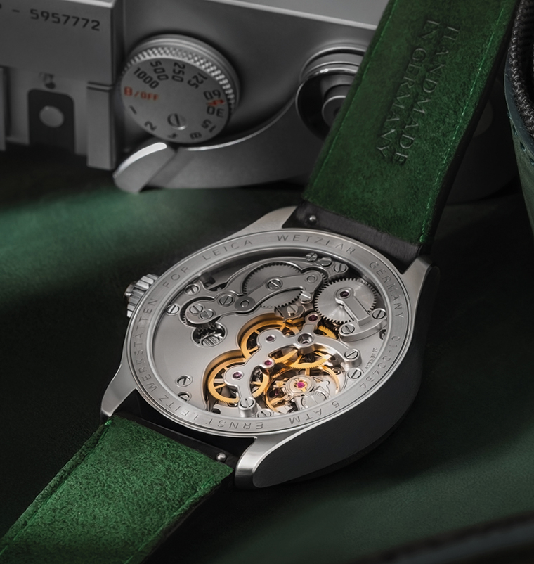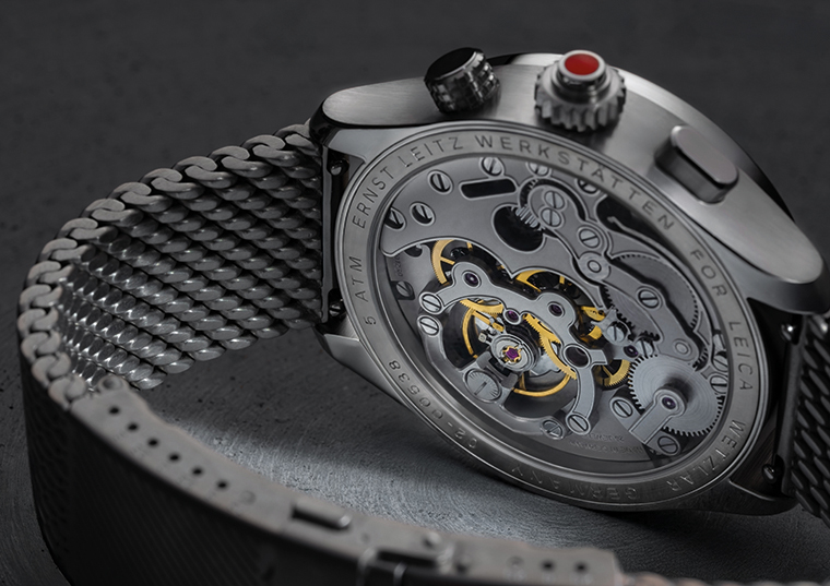 เม็ดมะยมระบบ push-crown ที่ออกแบบขึ้นโดยได้รับแรงบันดาลใจจากปุ่มชัตเตอร์ของกล้อง Leica เป็นนวัตกรรมสำคัญ—เพียงกดครั้งเดียว กลไกจะหยุดเดิน เข็มวินาทีจะกลับสู่จุดศูนย์ และพร้อมให้ตั้งเวลาใหม่อย่างแม่นยำ นี่คือการออกแบบฟังก์ชันพื้นฐานของนาฬิกาในแนวทางที่ “เป็น Leica” อย่างชัดเจน