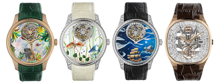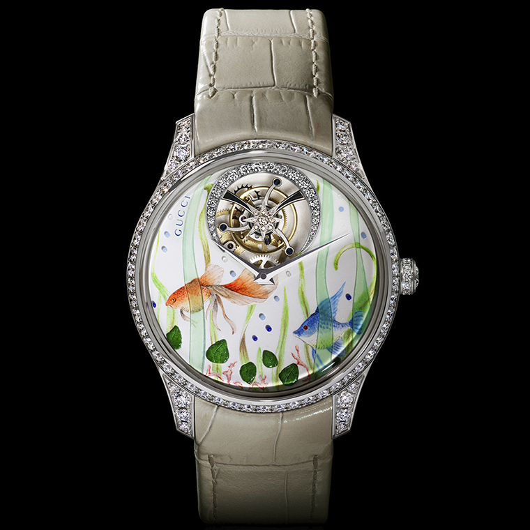 คอลเลกชัน G-Timeless หนึ่งในผลงานเปี่ยมเอกลักษณ์ของ Gucci ได้รับการเติมเต็มด้วยนาฬิกาใหม่ 5 เรือนสุดหรู ที่รังสรรค์ขึ้นด้วยเทคนิคชั้นสูงของ Métiers d'Art โดยได้แรงบันดาลใจจากผ้าพันคอไหมลายเก่าในคลังมรดกของแบรนด์ แต่ละเรือนเปรียบดั่งงานศิลปะเฉพาะตัว ถ่ายทอดความเชี่ยวชาญด้านเทคนิคของ Gucci อย่างลึกซึ้ง หน้าปัดทำหน้าที่เสมือนผืนผ้าใบจิ๋ว อุทิศให้กับงานหัตถศิลป์โบราณและศาสตร์แห่งการประดิษฐ์นาฬิกาชั้นสูง ทุกเรือนมีขนาด 40 มิลลิเมตร ประดับกลไกทูร์บิญองฝังเพชร และฝาหลังแกะสลักลวดลายด้วยมืออย่างประณีต