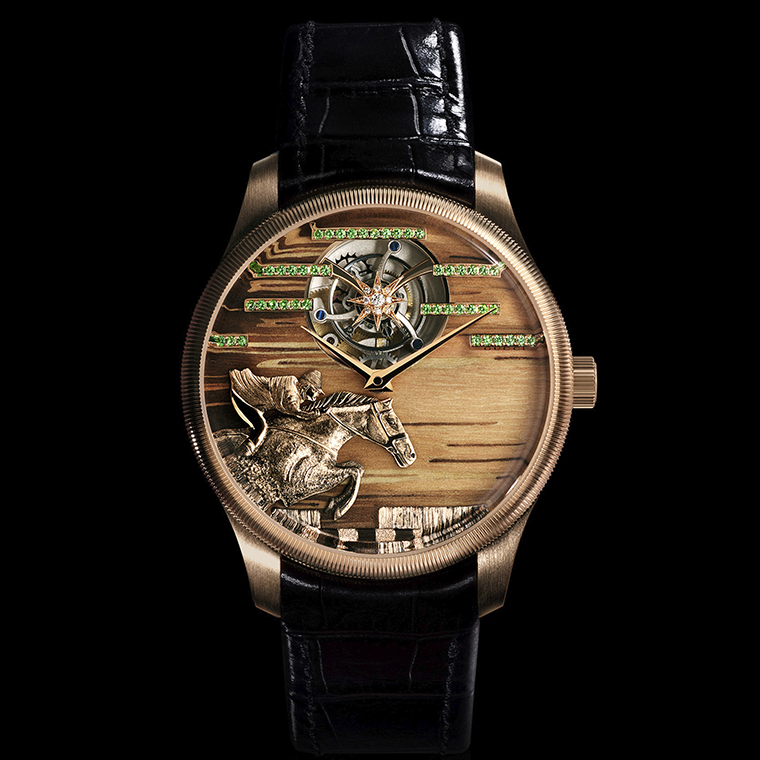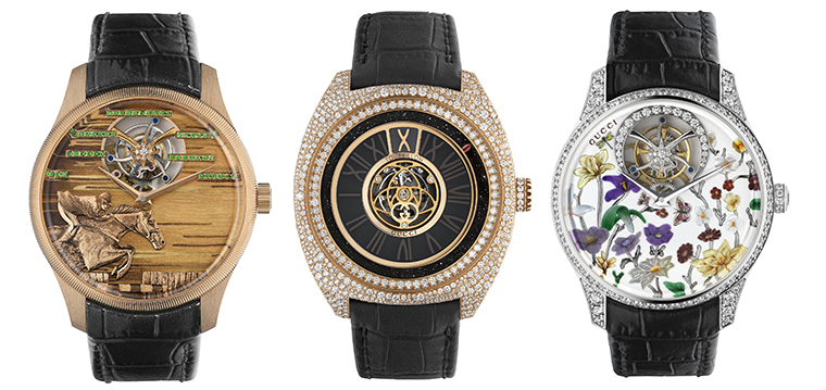 เรือนสุดท้ายถ่ายทอดความเร้าใจของกีฬาขี่ม้า ซึ่งเป็นหนึ่งในสัญลักษณ์สำคัญของ Gucci จากผ้าพันคอวินเทจ สู่หน้าปัดที่ประดิษฐ์จากไม้โอลีฟอิตาเลียน 40 ชิ้น ใช้เทคนิคไมโครมาร์เก็ตทรี พร้อมชิ้นงานทองคำโรสโกลด์แกะสลักเป็นรูปม้าและนักขี่ม้า ซึ่งเพ้นท์สีด้วยมือ และประดับด้วยซาโวไรต์ไล่เฉดที่เพิ่มมิติของการเคลื่อนไหวให้กับตัวเรือน ปิดท้ายด้วยสายจระเข้สีดำอย่างสง่างามและทรงพลัง