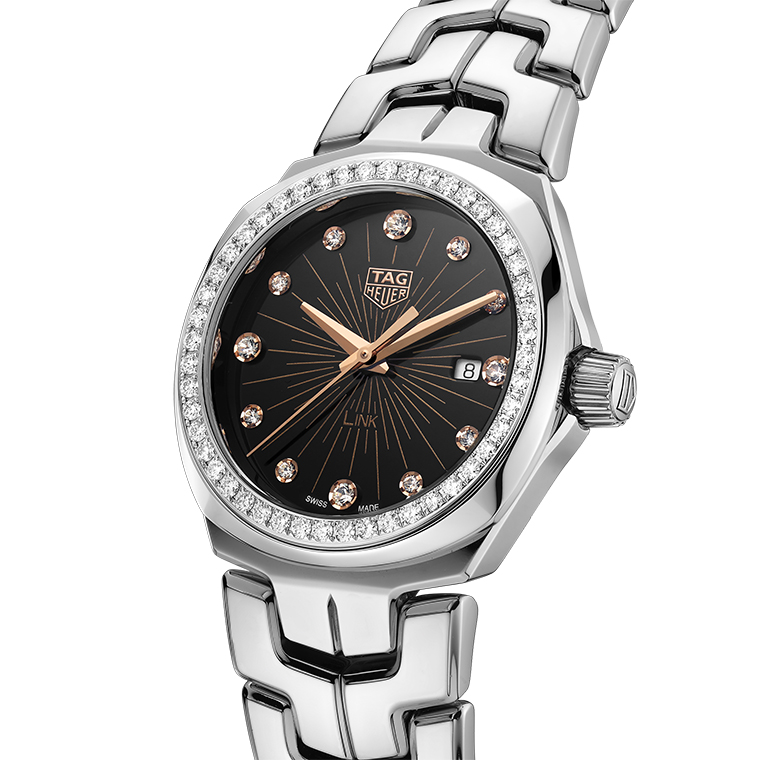เรือนเวลาสุดล้ำค่าอีกหนึ่งเรือนที่สะท้อนความหรูหราผ่านสาย S-shaped อันเป็นเอกลักษณ์ และหน้าปัดสีดำเงางามตกแต่งด้วยลาย Radial Sparks ประดับเพชรน้ำงาม 12 เม็ด ณ หลักบอกเวลา เพิ่มความโดดเด่นด้วยโลโก้รูปทรงโล่ของ TAG Heuer และเข็มนาฬิกาเคลือบด้วยโรสโกลด์ 5N ด้วยตัวเรือนสตีลขนาดกะทัดรัด 32 มม. ขอบตัวเรือนโรสโกลด์ที่มอบความสมดุลระหว่างความแข็งแกร่งและความหรูหรา มาพร้อมกระจกแซฟไฟร์กันแสงสะท้อนและฝาหลังขันเกลียวที่ช่วยเพิ่มความทนทาน