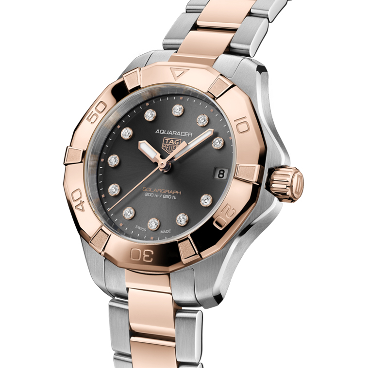 เติมประกายแห่งความสง่างามด้วยเรือนเวลาสองโทนรุ่นใหม่ล่าสุดจาก TAG Heuer ที่ผสานสตีลขัดเงาเข้ากับโรสโกลด์เคลือบพิงค์โกลด์อย่างประณีต หน้าปัดสีดำลวดลายซันเรย์แต่งแต้มความระยิบระยับด้วยหลักบอกเวลา 11 ตำแหน่งประดับเพชร เปล่งประกายดั่งแสงสุดท้ายของวันสะท้อนผิวน้ำ เสริมด้วยขอบตัวเรือนแบบหมุนได้ และสามารถกันน้ำลึกถึง 200 เมตร โดดเด่นด้วยกลไก Solargraph ที่เปลี่ยนทั้งแสงธรรมชาติและแสงไฟให้กลายเป็นพลังงาน พร้อมมอบความแม่นยำสูงและพลังงานสำรองนานถึง 10 เดือนแม้ในที่มืด