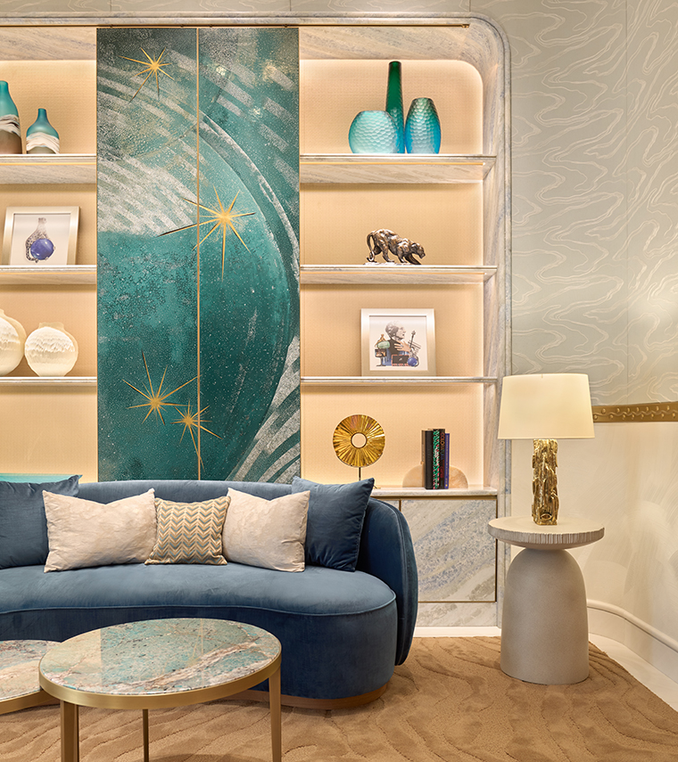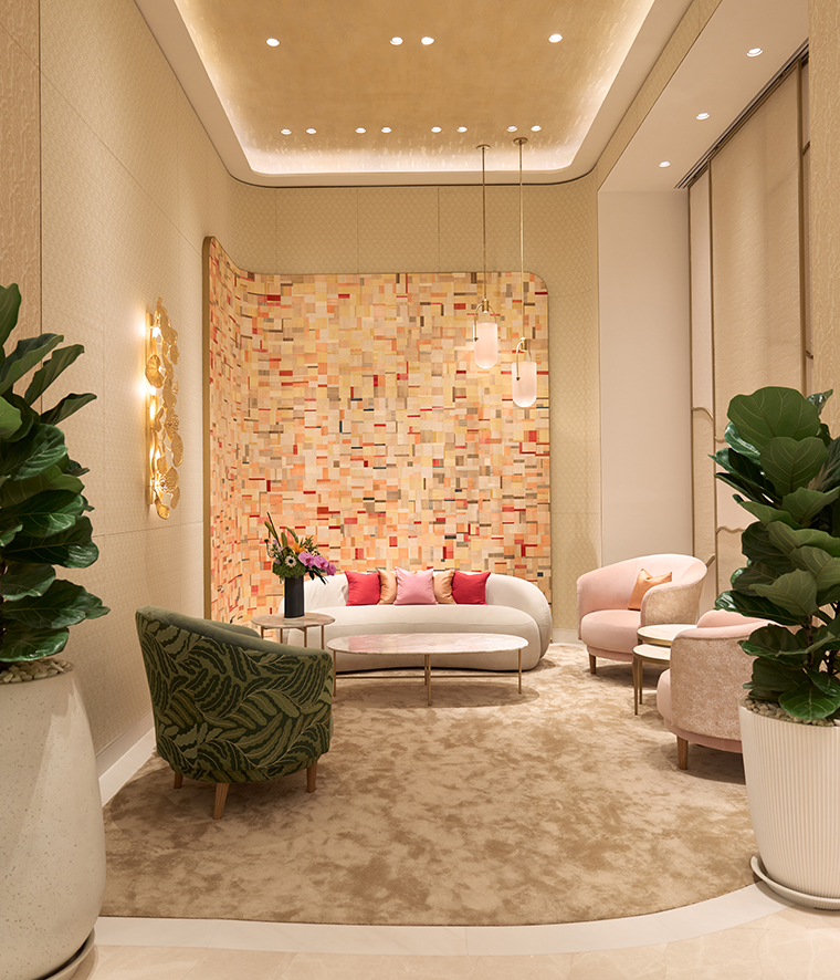บรรยากาศอันอบอุ่นชวนผ่อนคลายในห้องต้อนรับของบูติคถูกขับเน้นให้โดดเด่นยิ่งขึ้นด้วยพลังชีวิตชีวาในแบบฉบับของเมืองกรุงเทพฯ ศิลปะการต่อฟาง (straw marquetry) ผลงานจาก Muse Design รังสรรค์ขึ้นจากวัสดุธรรมชาติอย่างฟางข้าวโพดและฟางข้าวด้วยการผสมผสานเทคนิคตะวันตกเข้ากับวัสดุท้องถิ่นของไทย เพื่อถ่ายทอดแรงบันดาลใจจากมหานครที่ไม่เคยหลับใหล เมืองที่แสงไฟยามค่ำคืนเป็นประกายดุจดวงดาวบนฟากฟ้า การเลือกใช้วัสดุธรรมชาติจากท้องถิ่นควบคู่กับการตีความงานหัตถศิลป์ในมุมมองใหม่สะท้อนถึงความมุ่งมั่นของคาร์เทียร์ในการถ่ายทอดความงามจากธรรมชาติ และการเชิดชูภูมิปัญญาช่างฝีมือไทยผ่านมุมมองแห่งความร่วมสมัย