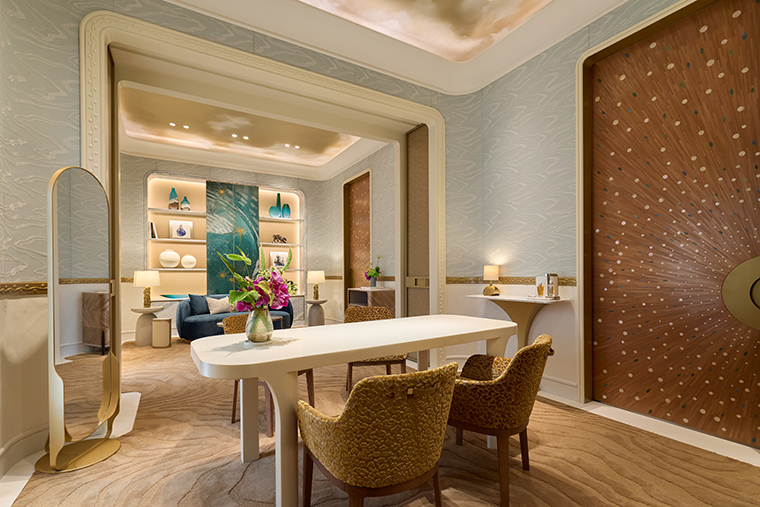 เมื่อก้าวเข้าสู่ห้องรับรองวีไอพีจะพบกับพื้นที่ที่สุดแห่งความหรูหราและเป็นส่วนตัว ซึ่งโดดเด่นด้วยผลงานชิ้นเอกจากอาจารย์มานพ วงศ์น้อย ศิลปินแห่งชาติและครูศิลป์แห่งแผ่นดิน ผู้ถ่ายทอดความงดงามของศิลปะไทยอย่างการลงรักปิดทองผสมผสานกับการใช้เปลือกไข่อันบอบบาง นับเป็นหนึ่งในงานหัตถศิลป์ดั้งเดิมอันทรงคุณค่า ผลงานชิ้นนี้จินตนาการถึงดินแดนแห่งสรวงสวรรค์ที่ซึ่งประกายทอง เงิน และผิวสัมผัสจากธรรมชาติหลอมรวมกันอย่างกลมกลืนเหนือกาลเวลา กระบวนการสร้างสรรค์อย่างพิถีพิถันหลายขั้นตอนใช้เวลายาวนานกว่าสี่เดือน จนได้พื้นผิวที่แวววาวราวกับแสงดาวบนท้องฟ้ายามค่ำคืน ส่งให้ห้องแห่งนี้เป็นพื้นที่ที่ทุกความปรารถนาจะถูกเติมเต็ม และทุกคำอธิษฐานล้วนเป็นจริงได้อย่างสมบูรณ์ และเช่นเดียวกับผลงานสร้างสรรค์ระดับตำนานของคาร์เทียร์ ผลงานศิลป์ในห้องแห่งนี้คือตัวแทนของความทุ่มเท และมรดกแห่งงานฝีมือที่สืบทอดอย่างยั่งยืนไม่เสื่อมคลาย
