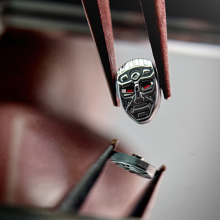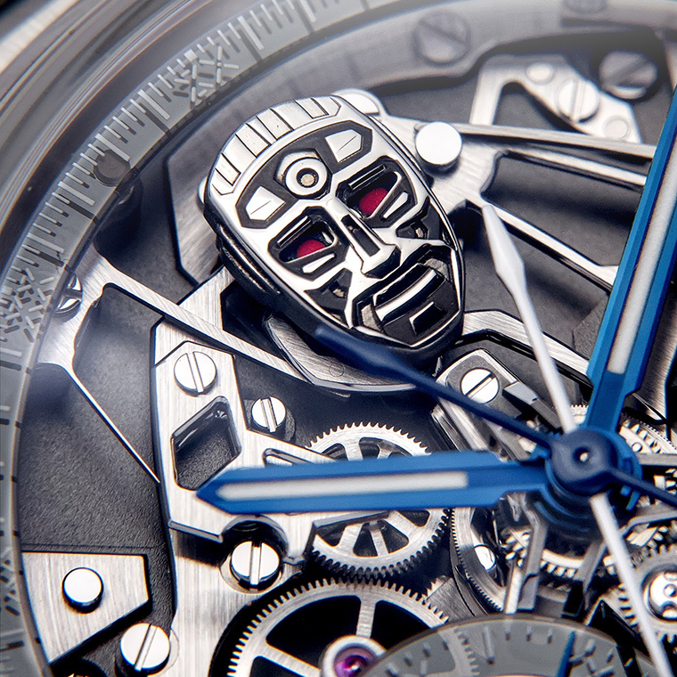 หน้าปัดรุ่น R.U.R. โดดเด่นด้วยรายละเอียดเฉพาะ เช่น เข็มโครโนกราฟสีขาว เข็มแยกวินาทีอลูมิเนียมสีน้ำเงินปลายขาว และสัญลักษณ์ “XX” บนวงจับเวลารอบนอกและซับไดอัล ซึ่งแทนภาษาหุ่นยนต์ที่ได้รับแรงบันดาลใจจากอักษร Yautja ในภาพยนตร์ Predator ตีความอย่างขี้เล่นร่วมกับตัวอักษร “X” ของ Xavier de Roquemaurel ซีอีโอของแบรนด์นั่นเอง หัวหุ่นยนต์ที่ถูกวางเด่นกลางกลไกคือผลงานศิลป์ย่อส่วน สร้างขึ้นโดยพันธมิตร MD’Art จากไทเทเนียม ผ่านการตัด ขัดเงา และสลักด้วยเลเซอร์อย่างประณีต ก่อนระบายสีตาทีละดวงด้วยโทนนีออนสดใสทั้งสามเฉด