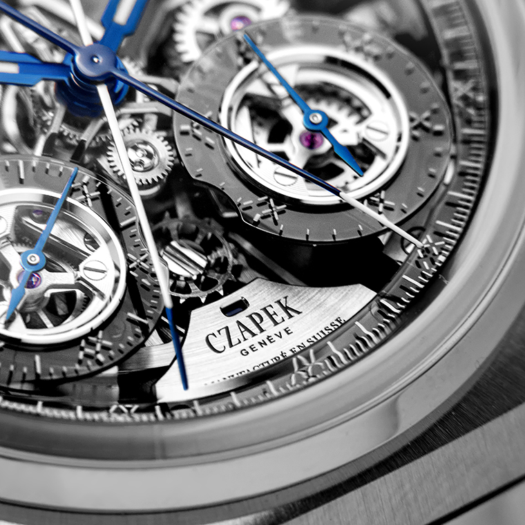 กลไกคาลิเบอร์ SXH6 ซึ่งพัฒนาโดย Jean-François Mojon แห่ง Chronode ได้พลิกแนวคิดการออกแบบ โดยนำกลไกจับเวลาวินาทีแยก (split-seconds chronograph) ที่ปกติซ่อนอยู่ด้านหลังเครื่อง ให้ขึ้นมาอยู่บนด้านหน้าปัด ผู้สวมใส่จึงได้ชมทุกจังหวะของคอลัมน์วีล แคลมป์ และคลัตช์ที่ทำงานสอดประสานกันอย่างงดงาม หัวหุ่นยนต์ถูกติดตั้งไว้เหนือคอลัมน์วีล เมื่อกดปุ่มสตาร์ท สต็อป หรือรีเซ็ต กลไกจะสั่งให้ดวงตาของหุ่นยนต์เปลี่ยนสีในทันที ผสานรูปแบบและหน้าที่เข้าด้วยกันอย่างแยบยล เพื่อให้หุ่นยนต์ดูสมบูรณ์แบบที่สุด ทีมงานต้องทดลองปรับพื้นผิวและสีสันนับครั้งไม่ถ้วน แม้เพียงการเปลี่ยนเฉดสีเล็กน้อยก็ส่งผลต่อสมดุลโดยรวม นี่คือความพิถีพิถันในระดับศิลปะชั้นสูงที่สะท้อนอัตลักษณ์ของ Czapek อย่างแท้จริง