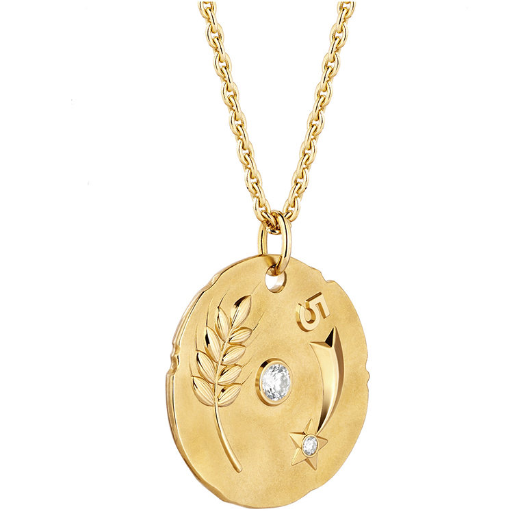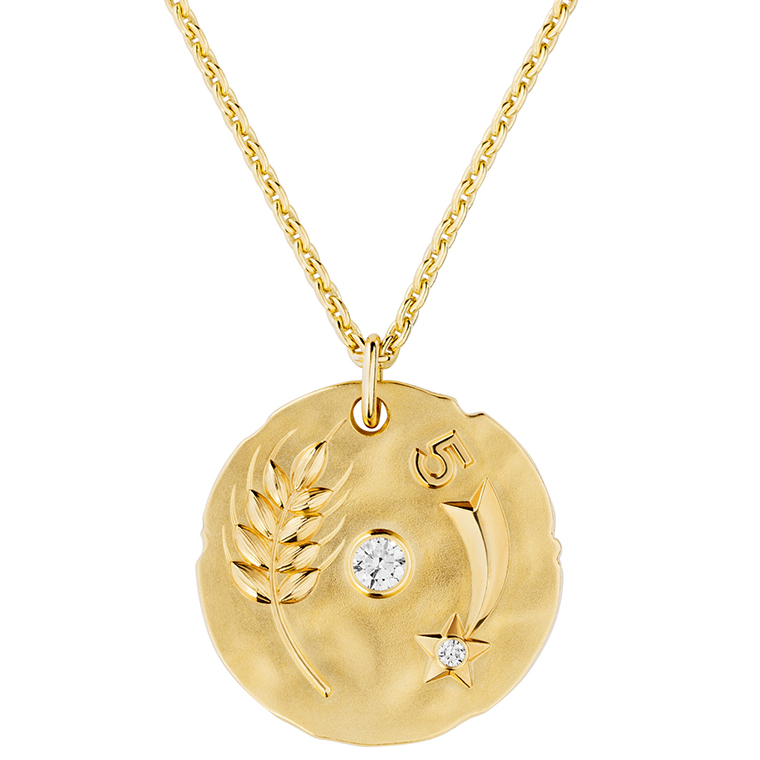 จี้รูปเหรียญ TALISMANS ได้รับแรงบันดาลใจจากเหรียญโบราณด้วยรูปทรงขอบที่ไม่เรียบและพื้นผิวทรายขัดอย่างไม่สมํ่าเสมอ ซึ่งช่วยขับเน้นให้รวงข้าวสาลี ดาวหาง และเลข 5 โดดเด่นขึ้นด้วยการขัดเงาแบบกระจก ด้านหลังของจี้รูปเหรียญประดับลายเซ็นของกาเบรียล ชาเนลไว้ใต้ดวงดาวที่ฝังเพชรอย่างงดงาม สวมใส่จี้รูปเหรียญ TALISMANS นี้เพื่อเปิดรับพลังแห่งโชคในทุกแง่มุมผ่านดีไซน์ที่เปี่ยมไปด้วยรายละเอียดและมิติที่น่าหลงใหล