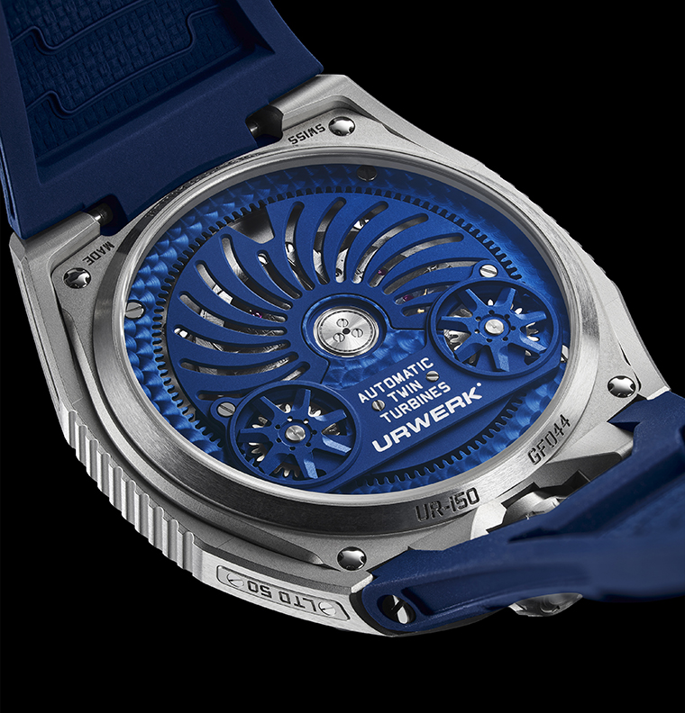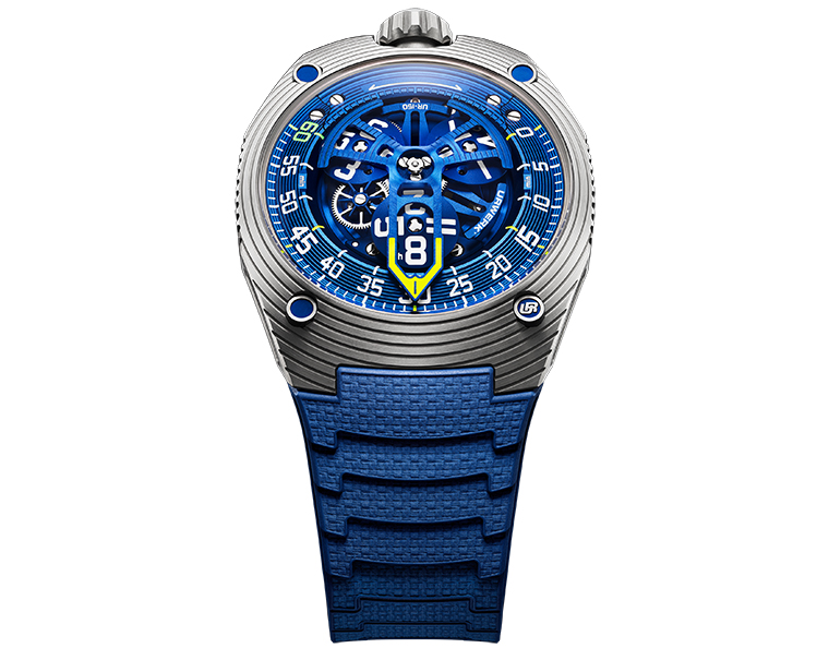 แม้จะมีชื่อที่ฟังดูดึงดูดใจ แต่ UR-150 Blue Scorpion กลับเป็นผลงานที่สง่างามและแตกต่าง เส้นสายของตัวเรือนโค้งมนและต่อเนื่องเป็นหนึ่งเดียว กระจกแซฟไฟร์รองรับรูปทรงของตัวเรือนอย่างไร้รอยต่อ ซึ่งทอดยาวไปสู่สายยางที่ยืดหยุ่น ผลลัพธ์คือนาฬิกาที่ออกแบบอย่างลงตัวตามหลักสรีรศาสตร์ โค้งรับกระชับข้อมือ พร้อมกับกลไกภายในที่เต็มเปี่ยมไปด้วยขุมพลังที่ถูกควบคุม