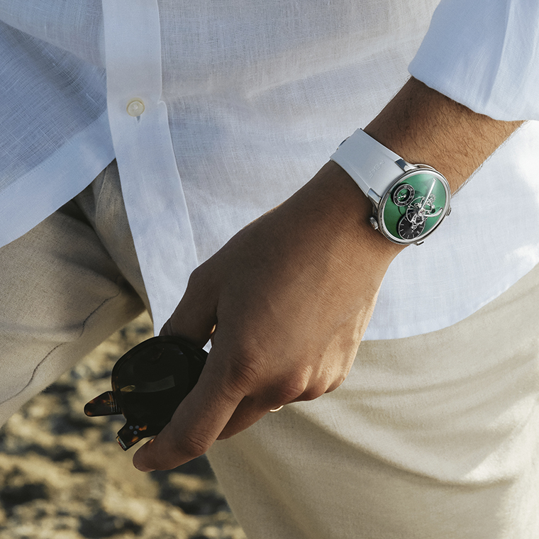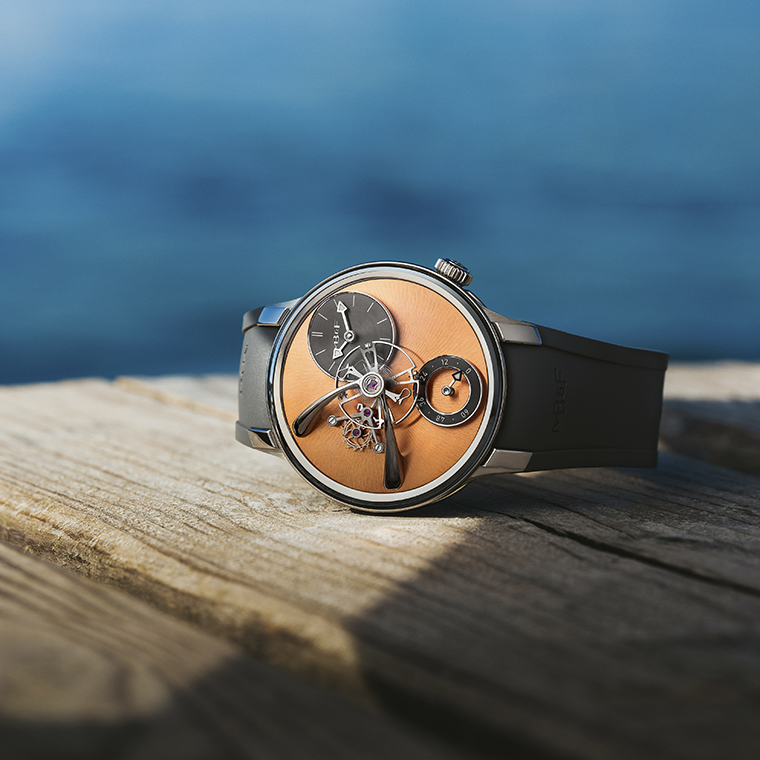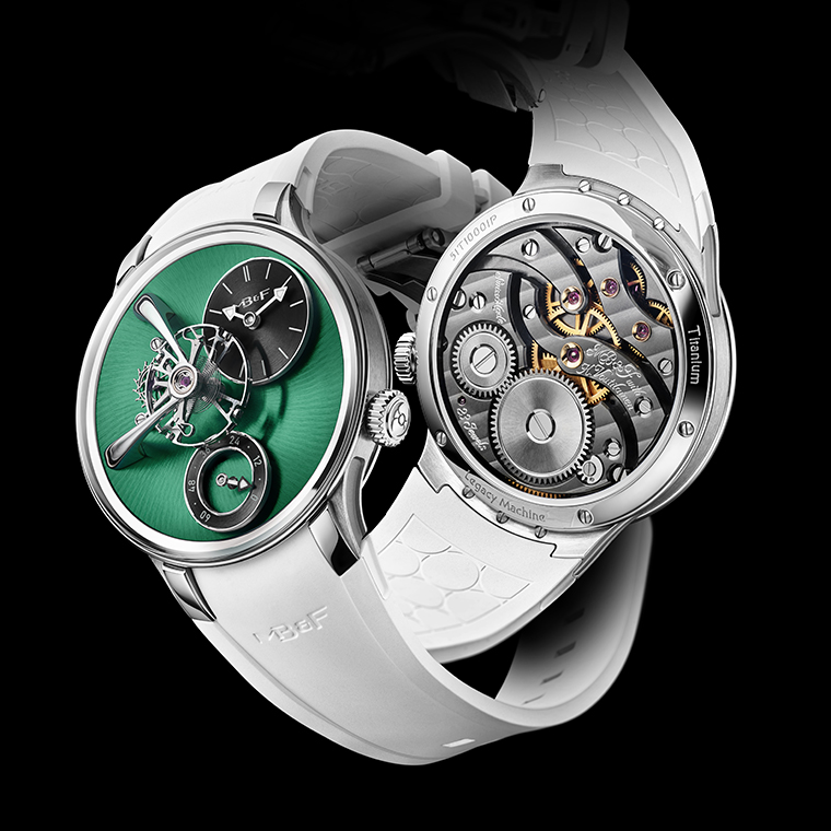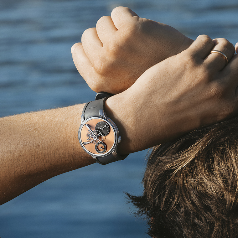 เฉดสีเขียว น้ำเงิน และม่วงอย่างมีมิติ ส่วนรุ่นสีแซลมอนก็ไม่แพ้กันในแง่ความคลาสสิก เพราะเป็นหนึ่งในสีที่พบได้ค่อนข้างน้อยในนาฬิกาของ MB&F