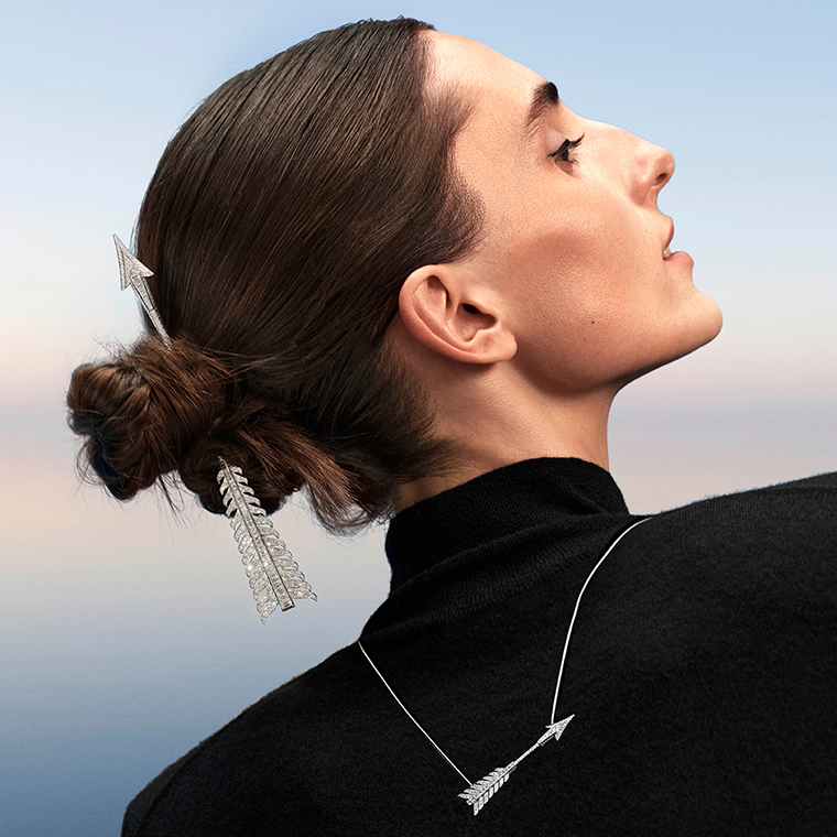 ด้วยแรงบันดาลใจจากชิ้นงานในตำนานของเมซง คอลเลกชั่นนี้มาพร้อมลูกศรในรูปแบบเข็มกลัดตามแบบฉบับดั้งเดิมสองชิ้น โดยชิ้นหนึ่งเผยความเรียบหรูในขนาดเล็กอย่างมีสไตล์ ส่วนอีกชิ้นโดดเด่นด้วยขนาด XXL ที่ผสานเพชรทรงกลมและทรงบาแก็ตที่เข้ากันได้อย่างน่าทึ่ง ถัดมาคือแหวนสองดีไซน์ โดยวงแรกออกแบบให้โอบล้อมนิ้วด้วยเพชรทรงกลมอย่างประณีต ส่วนวงที่สองดูมีมิติยิ่งขึ้นด้วยดีไซน์แบบพาดข้ามสามนิ้วมือ พร้อมจับคู่รายละเอียดส่วนขนนกด้วยเพชรทรงกลมเข้ากับความคมชัดของแนวสันจากเพชรทรงบาแก็ต นอกจากนี้ยังมีสร้อยคอและสร้อยข้อมือที่ออกแบบมาให้สามารถสวมใส่ได้โดยไม่ต้องใช้ตะขอ และปิดท้ายคอลเลกชั่นด้วยจี้และต่างหูแบบห่วงประดับเพชรทรงกลมที่สะท้อนความงดงามได้อย่างสมบูรณ์แบบ