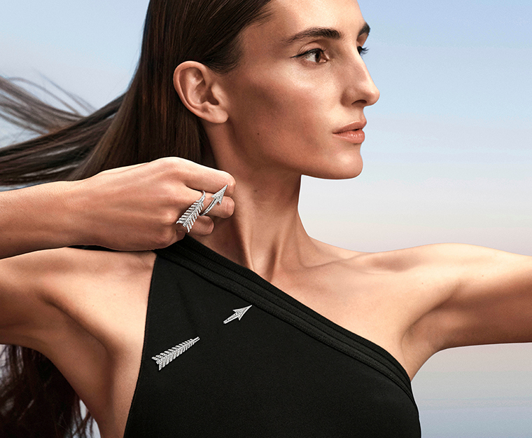 เสน่ห์ของพลานุภาพที่ซ่อนอยู่ในลูกศรคือความสมดุลระหว่างพลังอันแกร่งกล้าและความละเมียดละไม สิ่งนี้ได้จุดประกายให้แคลร์ ชวนส์ เลือกนำสัญลักษณ์ระดับตำนานนี้มารังสรรค์ขึ้นใหม่โดยยังคงลักษณะสำคัญไว้อย่างครบถ้วน เธอเลือกรักษาเส้นสายงานดีไซน์อันร่วมสมัยไว้พร้อมจินตนาการถึงวิธีการสวมใส่แบบใหม่ แม้ลูกศรยังคงมุ่งไปอย่างแน่วแน่ แต่ยังคงโค้งรับกับเรือนร่างของผู้สวมใส่ ทั้งการโอบล้อมนิ้วมือหรือข้อมือ และเคลื่อนตัวอย่างพลิ้วไหวอยู่รอบลำคอ หรือแนบชิดลงบนหน้าอกในรูปแบบของเข็มกลัด โดยคอลเลกชั่นนี้นำเสนอผลงานจำนวนทั้งหมด 8 ชิ้นที่ออกแบบอย่างไร้กรอบของเพศสภาพในโทนสีโมโนโครมประดับเพชรเพื่อสะท้อนจิตวิญญาณแห่งความร่วมสมัย