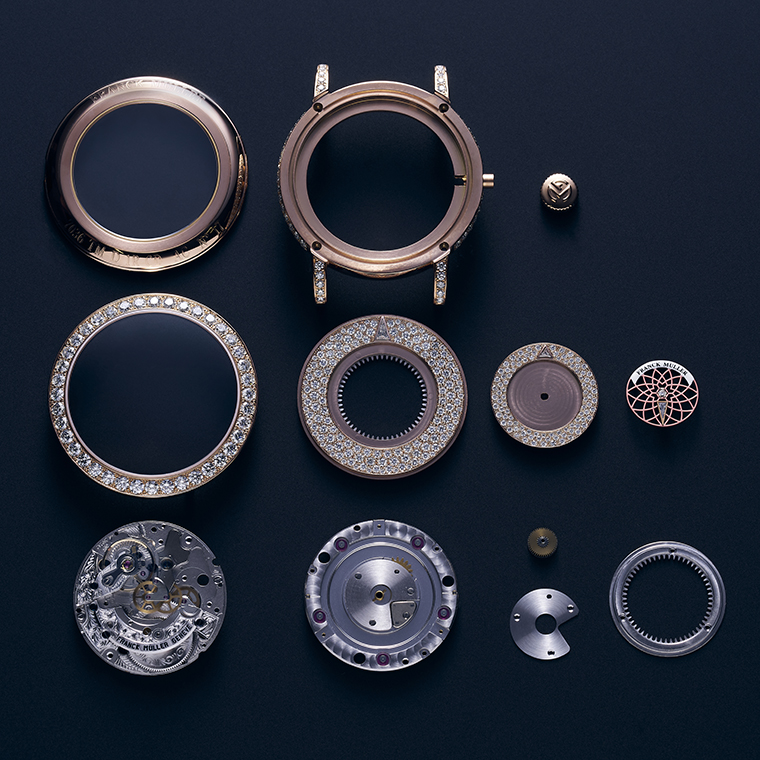 หลังจากการวิจัยและทดสอบด้วยวัสดุหลากชนิดหลายต่อหลายครั้ง นักประดิษฐ์ของ แฟรงค์ มุลเลอร์ พบว่าอะลูมิเนียมเป็นตัวเลือกที่ดีที่สุดสำหรับจานวินาที เพราะให้ความสมดุลอย่างเหมาะสมระหว่างความเบาและความแข็งแกร่งสำหรับการสร้างชิ้นงานแบบฉลุสเกเลตัน การกลึงชิ้นส่วนอย่างละเอียดอ่อนนี้ต้องอาศัยความแม่นยำในระดับสูงสุดเนื่องจากดีไซน์อันแสนบาง โดยขนาดโครงจะมีความกว้างเพียง 0.3 มิลลิเมตรเท่านั้น ซึ่งถือเป็นความสำเร็จที่เหนือธรรมดาในการผลิต