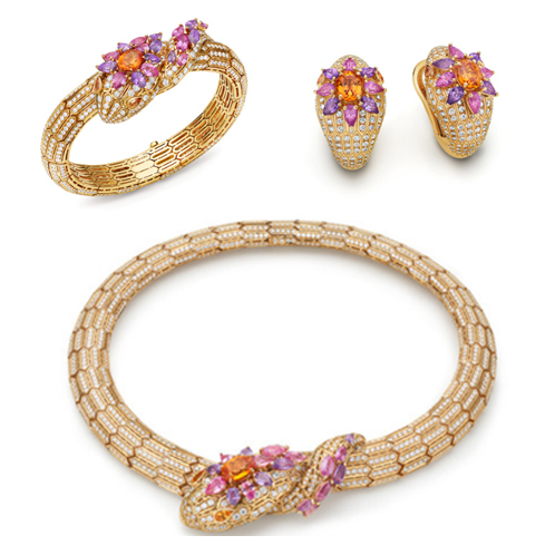 สร้อยคอ High Jewelry Serpenti ผลงานทองคำเหลืองประดับโอวัลท์การ์เนต 3.27 กะรัต, ซัฟไฟร์รูปแพร์และมาร์คีซ 18 เม็ด รวม 8.35 กะรัต, การ์เนตรูปแพร์สีส้ม 2 เม็ด และเพชร pavé