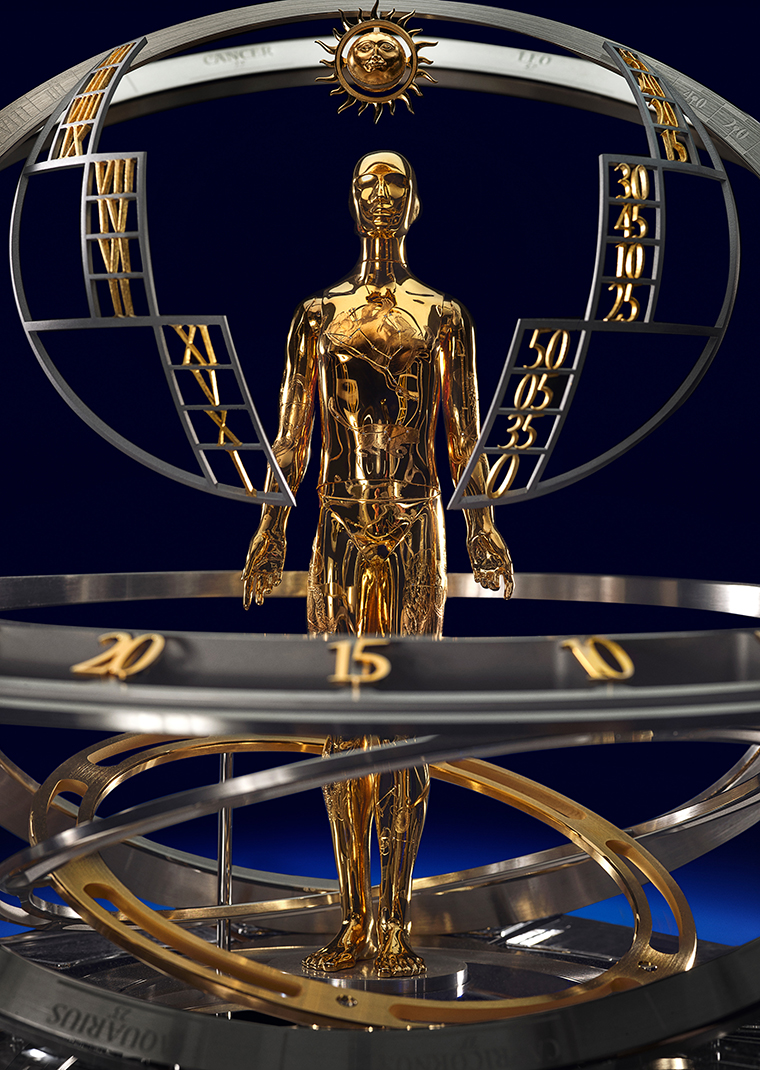ด้านหน้าปัดสะกดทุกสายตาด้วย หุ่นมนุษย์สีทอง ที่ใช้แขนบอกเวลาแบบ เรโทรเกรดคู่ โดยความพิเศษอยู่ที่สามารถเลือกอ่านเวลาได้สองรูปแบบ ทั้งแบบต่อเนื่องและตามคำสั่ง ประกอบกับตัวบ่งชี้พลังงานสำรองแบบเรโทรเกรด และดวงจันทร์สามมิติที่สะท้อนข้างขึ้นข้างแรมอย่างเที่ยงตรง