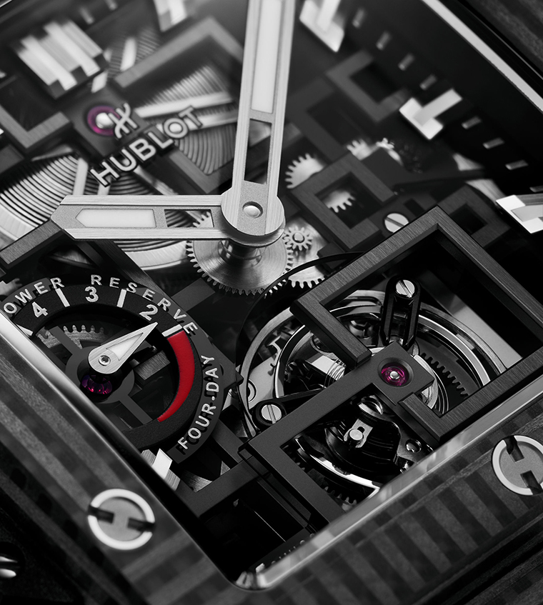 เพื่อเน้นย้ำรูปทรงสี่เหลี่ยมเรขาคณิต องค์ประกอบหลักของนาฬิกานี้จึงถูกจัดวางตามแนวทั้งสี่ด้านของตัวเรือนสี่เหลี่ยมอย่างพิถีพิถัน กลไกไขลานอยู่ทางด้านขวา, มาตรแสดงพลังงานสำรองอยู่ทางด้านซ้าย, บาร์เรลขนาดใหญ่อยู่ด้านบน และทูร์บิญองอยู่ด้านล่าง ทุกอย่างถูกจัดวางในตำแหน่งที่สมดุลและไม่มีรายละเอียดใดเล็ดลอดสายตาของผู้ที่หลงใหลในความประณีต เพราะกลไกทั้งชุดได้รับการออกแบบในรูปแบบสเกเลตันซึ่งเปิดให้เห็นโครงสร้างภายในทั้งหมด เส้นสายมุมฉากและรูปทรงเรขาคณิตดูราวกับลอยอยู่กลางอากาศ โครงสร้างที่ซับซ้อนนี้เต็มไปด้วยความชาญฉลาดโดยเป็นจุดบรรจบระหว่างวิศวกรรมและศิลปะที่สวยงามได้อย่างกลมกลืน สร้างสรรค์ออกเป็นกลไกที่มีน้ำหนักเบาเป็นพิเศษควบคู่ไปกับเอกลักษณ์อันโดดเด่นในฐานะนาฬิการูปแบบแรกในประเภทนี้ที่ Hublot ได้พัฒนาขึ้น