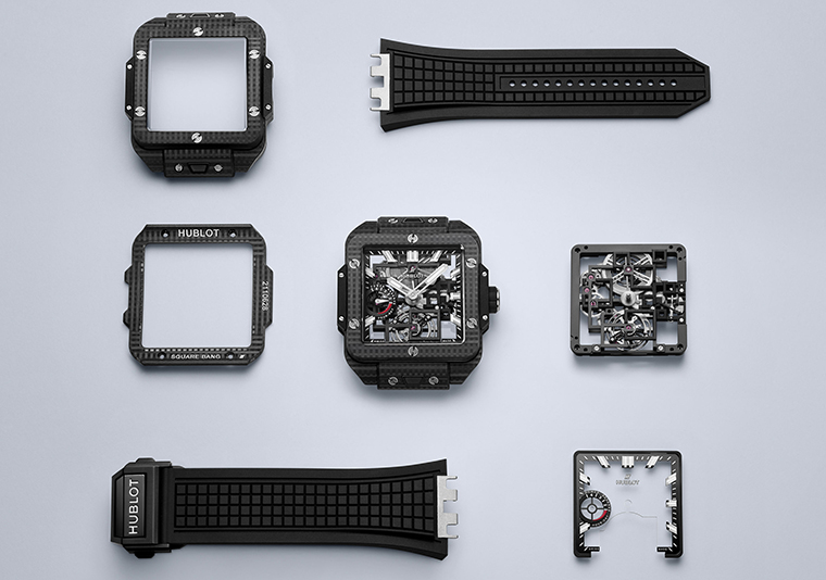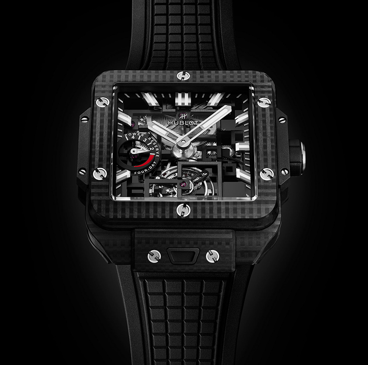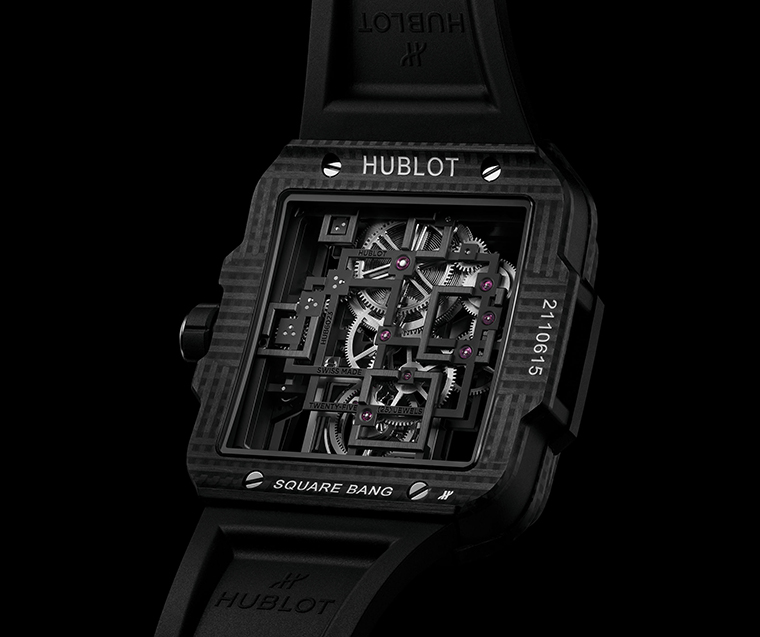 เพื่อเฉลิมฉลองการเปิดตัวกลไกทูร์บิญองครั้งแรกในตระกูล Square Bang ทาง Hublot ได้รังสรรค์ตัวเรือนรุ่นพิเศษขึ้นโดยเฉพาะ ผลิตจากวัสดุคาร์บอนทั้งชิ้น ขนาด 42 มิลลิเมตร นาฬิการุ่นนี้ถือเป็นนาฬิการุ่นแรกของคอลเลกชั่นที่มาพร้อมพื้นผิวแบบสามมิติ โดดเด่นด้วยวัสดุคอมโพสิตคาร์บอนถักลายแนวตั้งและแนวนอนที่ถูกออกแบบโดยอ้างอิงจากลวดลายทรงสี่เหลี่ยมเพื่อคงไว้ ซึ่งอัตลักษณ์อันแข็งแกร่งของคอลเลกชั่น Square Bang โดยแรงบันดาลใจเดียวกันนี้ยังสะท้อนผ่านสายยางของนาฬิกาซึ่งได้รับการออกแบบให้มีผิวสัมผัสเป็นลวดลายสี่เหลี่ยมสร้างความต่อเนื่องระหว่างองค์ประกอบภายนอกของนาฬิกาได้อย่างสมบูรณ์