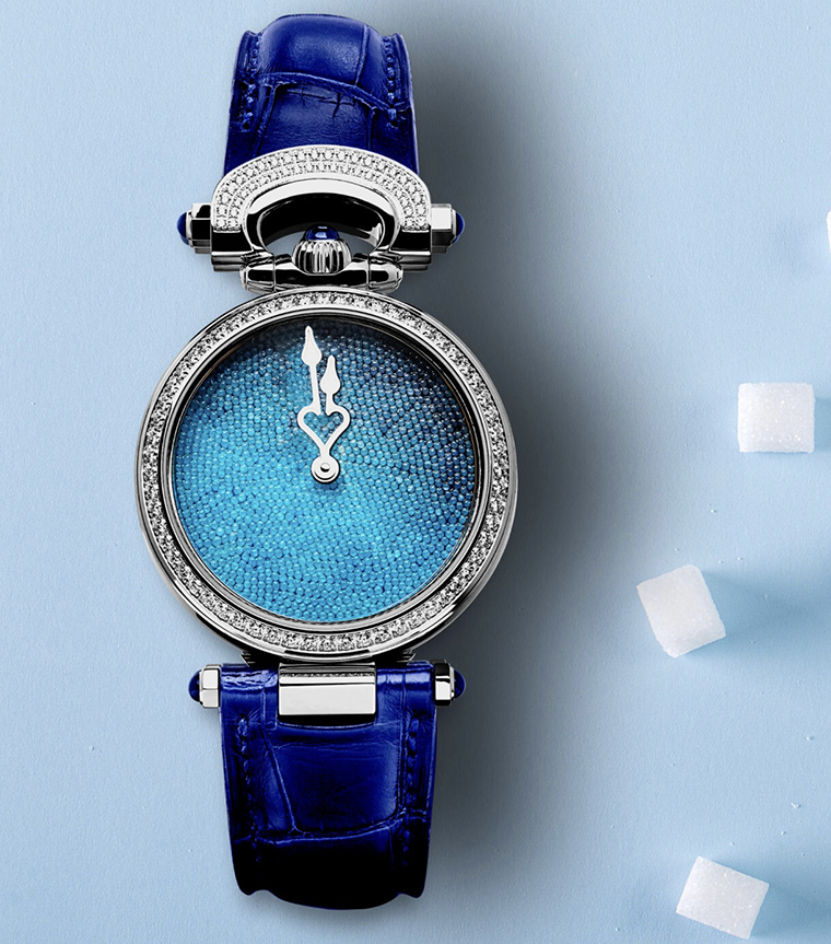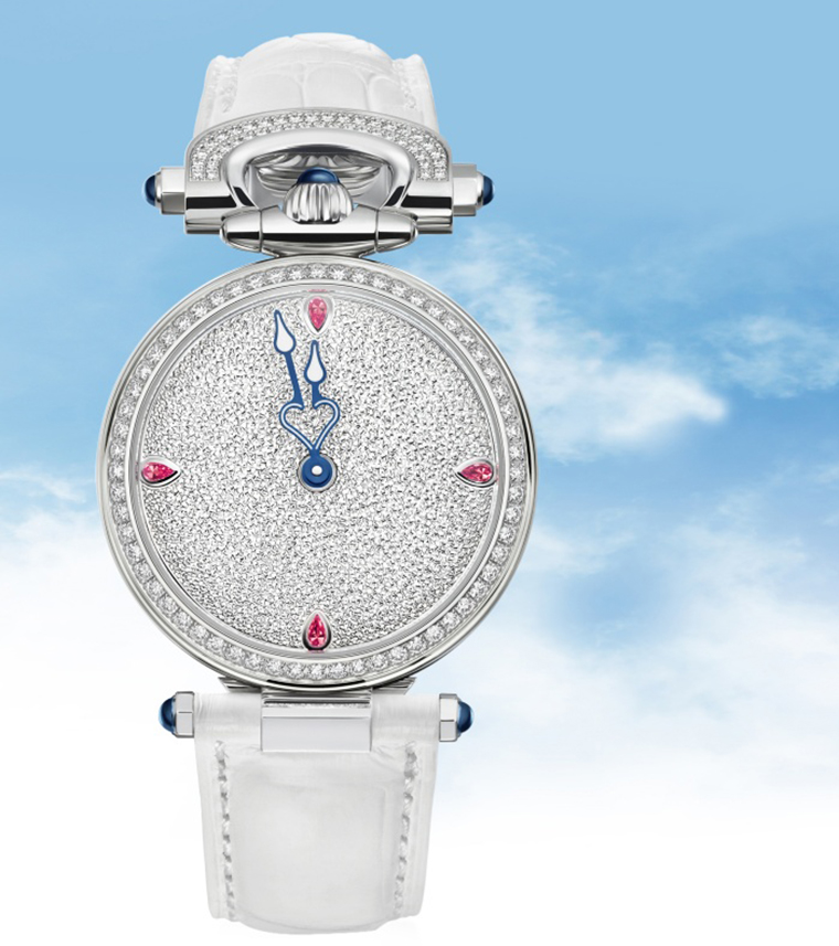 อีกหนึ่งผลงานชิ้นเอกที่งดงามสะกดสายตา โดดเด่นด้วยหน้าปัด “Bris de Verre” หรือเทคนิคกระจกแตกละเอียดอันวิจิตร เสมือนทุ่งหิมะขาวบริสุทธิ์ที่โปรยปรายลงมาเป็นประกายท่ามกลางแสงอาทิตย์ พร้อมด้วยหลักชี้เวลาที่ทำจากแซฟไฟร์ทรงลูกแพร์ทั้งสี่เม็ด อีกหนึ่งความพิเศษของเรือนเวลานี้อยู่ในขั้นตอนการแกะสลักด้วยเครื่องมือที่เรียกว่า “onglette” โดยช่างผู้ชำนาญที่แกะสลักรูปสามเหลี่ยมเล็ก ๆ นับพันครั้งเพื่อสร้างลวดลายระยิบระยับราวกับมีชีวิต พร้อมล้อมกรอบด้วยเพชรเจียระไน 103 เม็ดบนตัวเรือน Amadéo® สแตนเลสสตีลขนาด 36 มม.