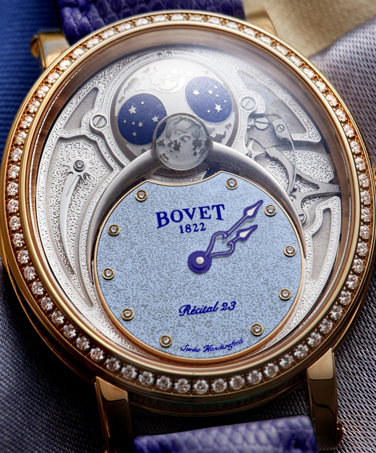 Récital 20 Astérium (GPHG 2023 – Calendar & Astronomy Winner) Astérium คือสุดยอดผลงานที่รังสรรค์หอดูดาวที่สามารถสวมใส่ได้บนข้อมือ โดดเด่นด้วยโดมท้องฟ้ายามค่ำคืนที่แสดงเวลา 24 ชั่วโมง รายล้อมด้วยสมการเวลา (Equation of Time) ฟังก์ชันข้างขึ้นข้างแรม (Moonphase) และฟังก์ชันเข็มนาทีย้อนกลับ (Retrograde Minutes) พร้อมด้วยกลไล Flying Tourbillon แบบคู่ และพลังงานสำรอง 10 วัน โดยฉากหลังมีปฏิทินประจำปีที่แสดงราศี วันที่ กลางคืนยาวนานที่สุดและกลางวันสั้นที่สุด (Solstices) พร้อมวันเริ่มฤดูใบไม้ผลิ และเริ่มฤดูใบไม้ร่วง (Equinoxes) ซึ่งถือได้ว่า BOVET สามารถถ่ายทอดจักรวาลทั้งหมดได้อย่างครบถ้วนผ่านกลไกอันสมบูรณ์แบบ