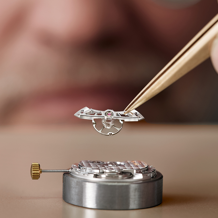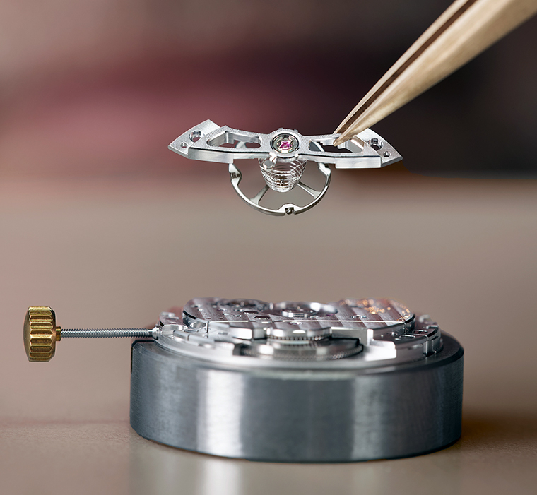 สะพานจักรชุบโรเดียมสลักข้อความสีทองรวมทั้งตรานกอินทรีย์ ตกแต่งด้วยลายเส้นตรง Côtes de Genève ขอบตัดเฉียงแบบเพชร และหัวสกรูขัดเงากระจก บริเวณฐานหลักที่มองเห็นมีพื้นผิวทรายเป่าอย่างประณีต พร้อมประทับคำว่า ‘SILICIUM ESCAPEMENT