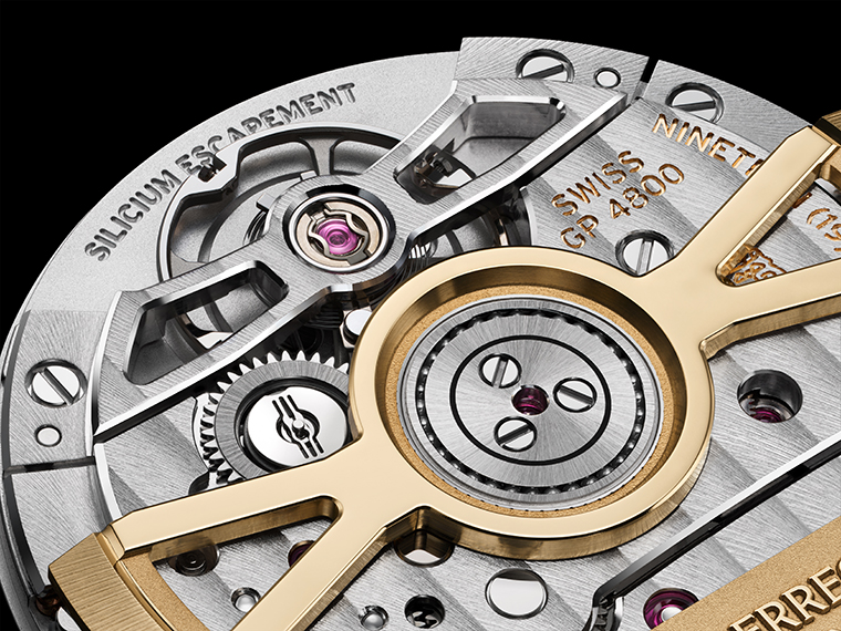 ใกล้กับบาลานซ์ แม้แต่พื้นผิวที่ซ่อนอยู่ก็ได้รับการประดับด้วยลายวงกลมบริเวณด้านล่างของแผ่นหลัก แสดงถึงความประณีตของแบรนด์ โรเตอร์ประดับลวดลายลูกศรขัดเงา เพื่อรำลึกถึงสะพานจักรดั้งเดิมในปี 1867 ด้านข้างตกแต่งด้วยการขัดทราย ลายเกลียว และเส้นตรง องค์ประกอบอื่นๆ เช่น คลัตช์ลูกปืนขัดเงาแบบซันเรย์ บาร์เรลขึ้นลานลายเกลียว และฟันเฟืองขัดผิวซาตินวงกลม ย้ำการผสมผสานระหว่างนวัตกรรมและมรดกดั้งเดิมการหลอมรวมของเทคนิคตกแต่งดั้งเดิมและสมัยใหม่ทำให้กลไก Calibre GP4800 เป็นมากกว่าความสำเร็จทางกลไก แต่ยังเป็นการแสดงออกทั้งภาพลักษณ์และความรู้สึกที่สะท้อนดีเอ็นเอของแบรนด์