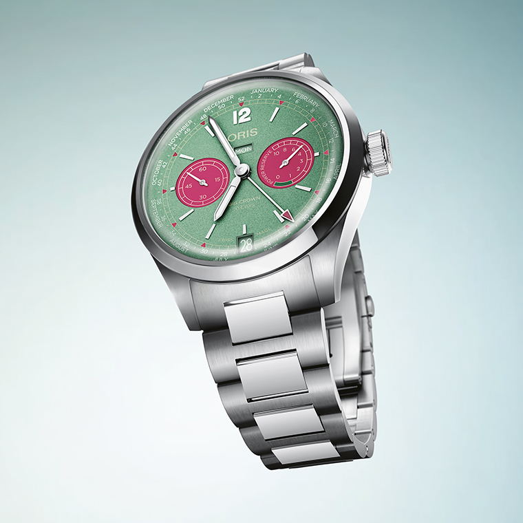 นักออกแบบของ Oris ได้เลือกใช้โทนสีที่น่าจดจำ เพื่อสะท้อนถึงความสุขที่หลอมรวมอยู่ในฟังก์ชั่นของนาฬิกา หน้าปัดหลักโดดเด่นด้วยสีเขียวมิ้นต์ ตัดกับหน้าปัดย่อยและรายละเอียดหน้าปัดบางส่วนในโทนสีชมพู Rose Pink เพิ่มความคมชัดด้วยดีเทลสีทองและสีขาว จับคู่มากับสายโลหะแบบเรียวที่สวมใส่สบายกระชับกับข้อมือ