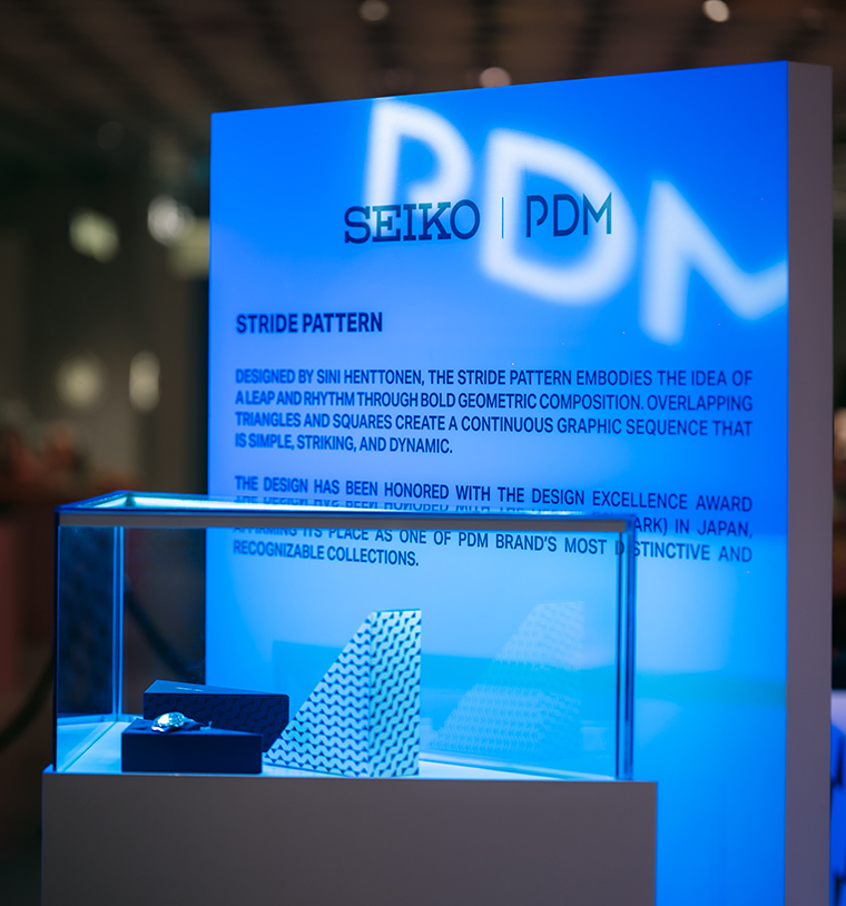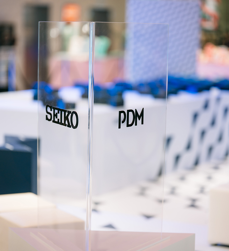 ภายในงานถูกตกแต่งด้วยงานดีไซน์ลวดลายสร้างชื่อจาก PDM Brand ที่เนรมิตให้จุดขายของ Seiko เปรียบเสมือนโชว์รูม ที่พร้อมต้อนรับลูกค้าทุกท่าน ให้ได้สัมผัสประสบการณ์แห่งงานดีไซน์สุดพรีเมียมเหมือนอยู่ท่ามกลางนิทรรศการงานศิลปะ ที่ถูกตกแต่งพื้นที่ด้วยกล่องนาฬิกาที่ถูกออกแบบมาในรูปทรง ‘สามเหลี่ยม’ สุดเอ็กซ์คลูซีฟ แตกต่างและแปลกตา ในเฉดสีขาว-น้ำเงิน ประดับอยู่ทั่วพื้นที่ เพื่อสร้างมิติล้อไปกับนาฬิกาไฮไลต์ของค่ำคืนที่ผ่านมา