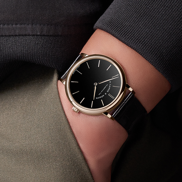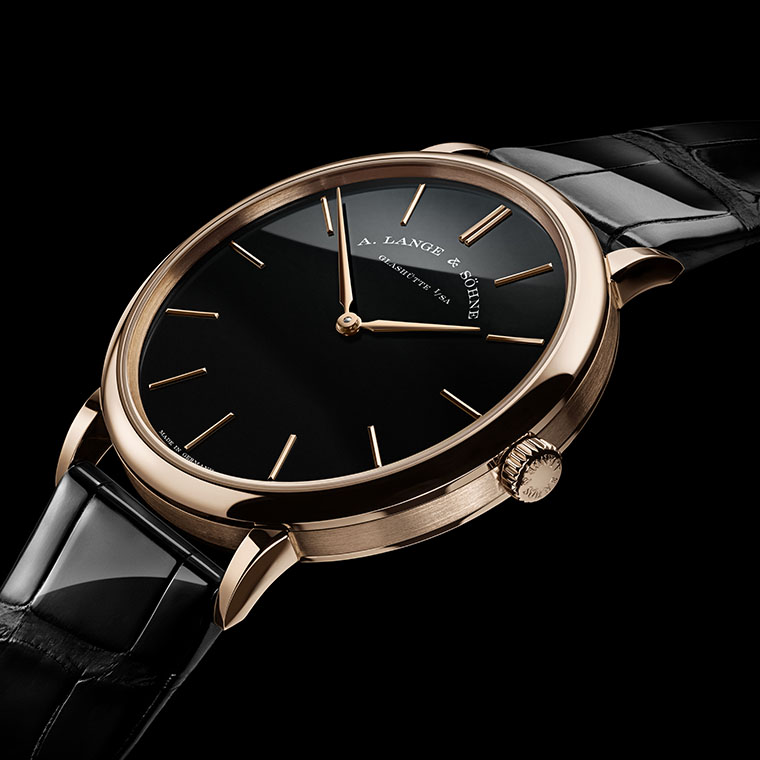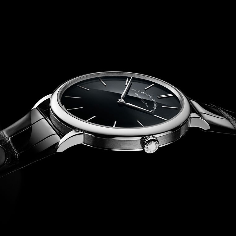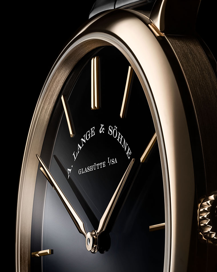 บุคลิกอันโดดเด่นของ Saxonia Thin ตั้งอยู่บนหลักการออกแบบ “Less is more” อย่างแท้จริง ความบางเฉียบของตัวเรือนที่มีเพียง 6.2 มิลลิเมตร และเส้นผ่านศูนย์กลาง 40 มิลลิเมตร แสดงให้เห็นความสง่างามในเชิงสถาปัตยกรรมของเวลา ตัวเรือนผลิตขึ้นจากทอง Honeygold ทองสูตรพิเศษเฉพาะของ Lange หรือแพลทินัม 950 ที่หรูหราสงบนิ่ง เมื่อผสานเข้ากับขาสายนาฬิกาที่โค้งเรียบลื่น นาฬิกาจึงโอบรับข้อมือได้อย่างพอดี และเลื่อนเก็บใต้แขนเสื้อเชิ้ตได้อย่างไร้ที่ติ