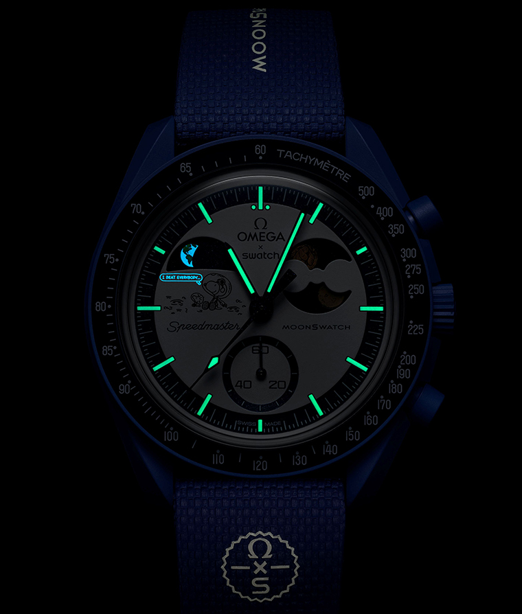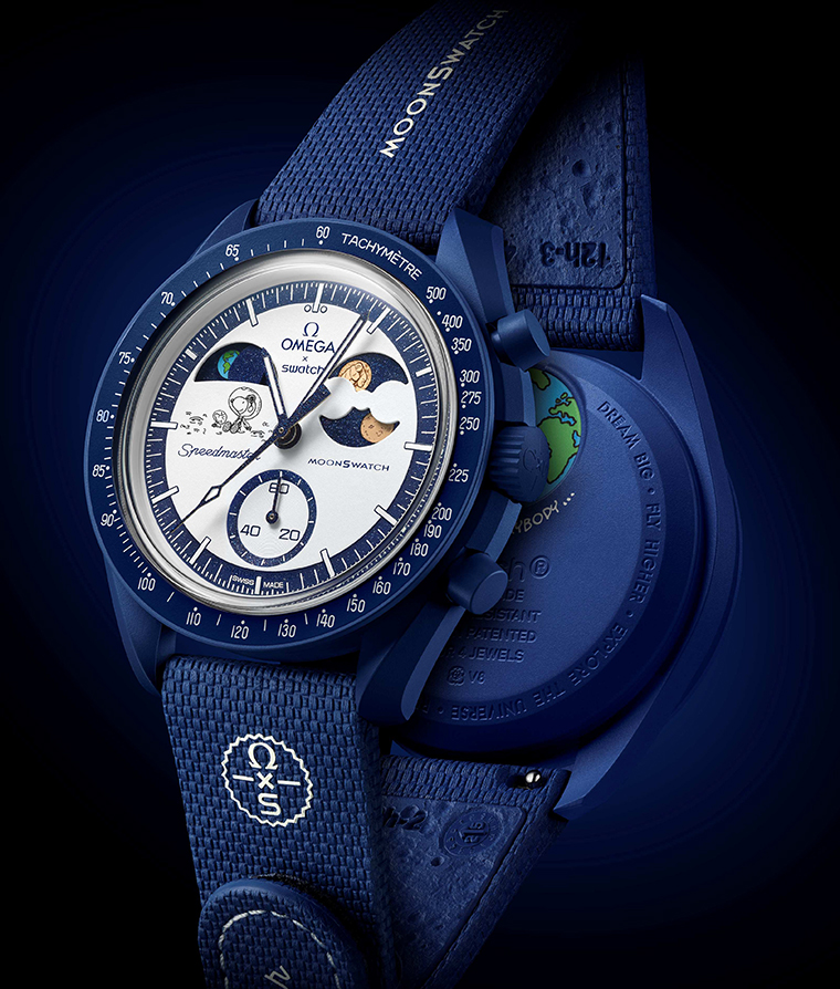 เรือนเวลาน้องใหม่นี้จะถอดแบบดีไซน์ของนาฬิการุ่นพี่โดยมีรูปแบบหน้าปัดแห่งหมู่ดาวแบบเดียวกัน พร้อมด้วยนวัตกรรมฟังก์ชันบอกดิถีของโลกล่าสุดของ Swatch ฟังก์ชันบอกดิถีของดวงจันทร์ที่เคลือบ Moonshine™ Gold ของ OMEGA และ รูปภาพจากจักรวาล Snoopy