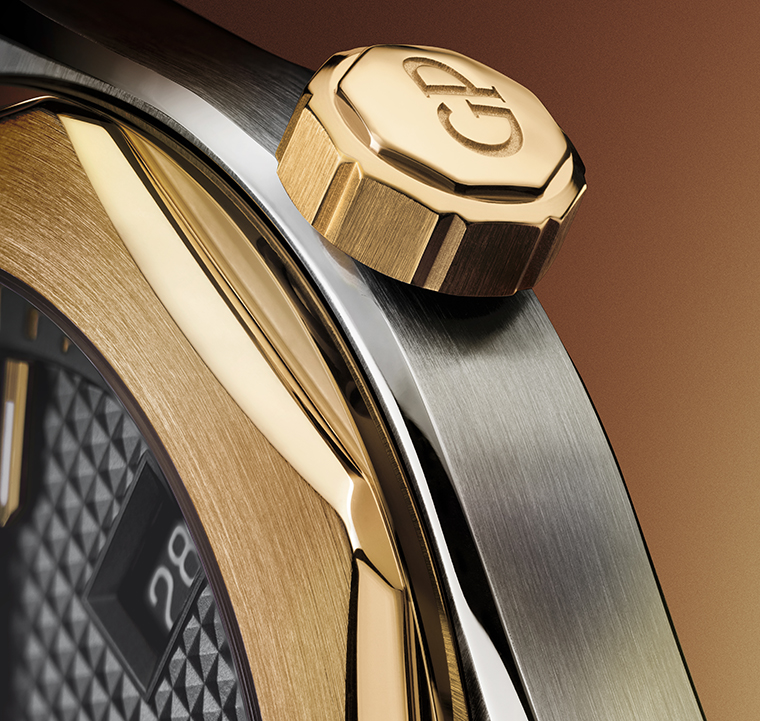 Laureato โดดเด่นทันทีที่ปรากฏ ด้วยอัตลักษณ์การออกแบบอันเป็นเอกลักษณ์: ขอบตัวเรือนทรงแปดเหลี่ยมซ้อนบนฐานกลม ตัวเรือนทรงตอนโนและสายโลหะแบบบูรณาการ ออกแบบโดยทีมดีไซเนอร์ภายในของ Girard-Perregaux ถ่ายทอดเส้นสายที่ลื่นไหล ผสานโครงสร้างทางสถาปัตยกรรมอย่างงดงาม
