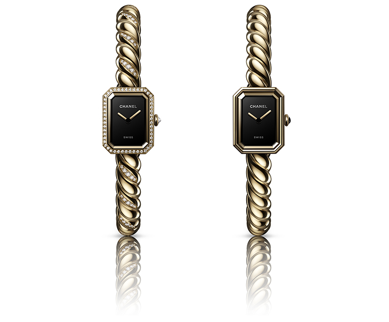 นาฬิกา PREMIÈRE GALON มาในรูปแบบของกำไลข้อมือที่รังสรรค์จากแถบเปียบิดเกลียวที่มอบรูปแบบในการสวมใส่ แบบใหม่ กำไลข้อมือเยลโลว์โกลด์ 18K เส้นนี้เน้นยํ้าความบริสุทธิ์เรียบง่ายของหน้าปัดเคลือบแลคเกอร์สีดำที่ไม่มีตำแหน่งแสดงเวลา และเนื่องจากแถบเปียของ Chanel นั้นมีหลากหลายเวอร์ชันไม่ต่างจากชุดสูท นาฬิกา PREMIÈRE GALON จึงเผยโฉมให้เลือกในแบบประดับเพชรถึง 2 เวอร์ชัน การตีความอันลํ้าค่าของนาฬิกา PREMIÈRE เรือนนี้คือการก้าวสู่โลกแห่ง จิวเวลรี่อย่างสง่างาม โดยยังคงไว้ซึ่งเอกลักษณ์ของงานกูตูร์อย่างสมบูรณ์แบบ