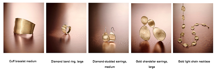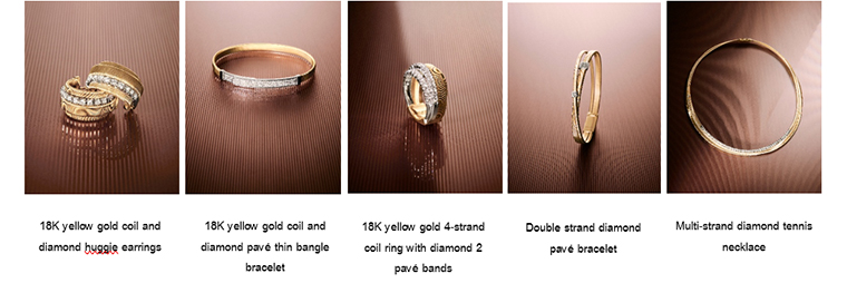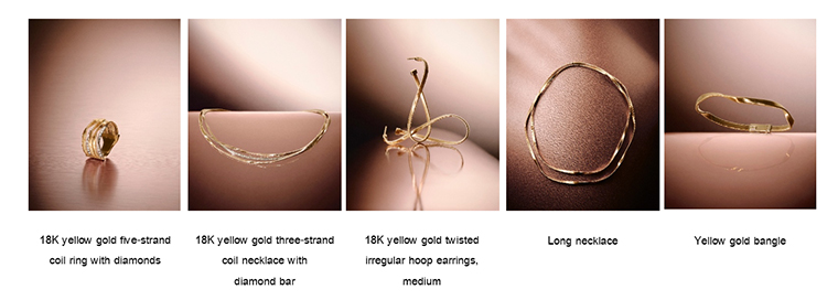 Marrakech จิตวิญญาณแรกเริ่มและเป็นคอลเลกชันแจ้งเกิดอันยิ่งใหญ่ของแบรนด์ แรงบันดาลใจจากเนินทรายแห่งทะเลทรายซาฮาราถูกนำมาตีความผ่านเทคนิคการบิดเกลียวทองคำอันเป็นเอกสิทธิ์ ก่อเกิดเป็นเส้นสายที่เย้ายวนและพลิ้วไหวสะท้อนแสงอย่างงดงาม ทั้ง กำไลทองคำ (Yellow gold bangle) และ สร้อยคอยาว (Long necklace) ที่มอบความรู้สึกหรูหราทว่าร่วมสมัย ไปจนถึง ต่างหูห่วงทองคำบิดเกลียวขนาดกลาง (18K yellow gold twisted irregular hoop earrings, medium) ที่สวมใส่ง่ายในทุกวัน พร้อมเพิ่มความเลอค่าด้วยประกายเพชรใน สร้อยคอทองคำ 3 เกลียวพร้อมบาร์เพชร (18K yellow gold three-strand coil necklace with diamond bar) และ แหวนทองคำ 5 เกลียวประดับเพชร (18K yellow gold five-strand coil ring with diamonds) อันเป็นที่สุดแห่งความสมบูรณ์แบบ