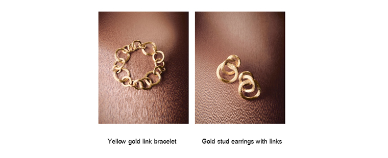 Jaipur ความงดงามอันเจิดจรัสของผลงานจิวเวลรีอันโดดเด่นที่รังสรรค์ขึ้นด้วยทองคำ ผสานความประณีตแบบอิตาเลียนเข้ากับแรงบันดาลใจจากเมืองหลวงแห่งจิวเวลรีของอินเดียผ่านรูปแบบอันวิจิตร สะท้อนความสง่างามเหนือระดับและเสน่ห์ล้ำลึกที่ถ่ายทอดเรื่องราวแห่งมรดกราชวงศ์ราชสถานได้อย่างน่าหลงใหล ผ่านความงามของทองคำล้วนในสร้อยข้อมือห่วงโซ่ทองคำ (Yellow gold link bracelet) และ ต่างหูห่วงโซ่ทองคำ (Gold stud earrings with links) สะท้อนถึงงานฝีมืออันไร้ที่ติ