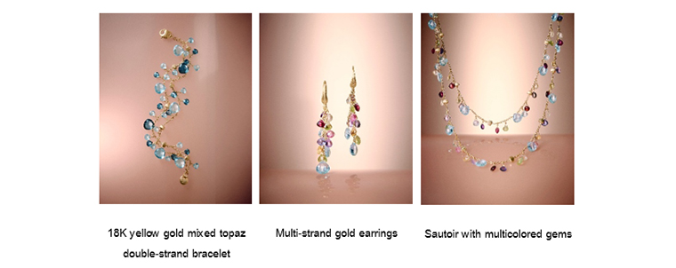 Paradise บทเพลงแห่งความสุขที่ได้แรงบันดาลใจจากสีสันและบรรยากาศอันสดใสของชายฝั่งทะเลเมดิเตอร์เรเนียน ถ่ายทอดผ่านการร้อยเรียงอัญมณีล้ำค่านานาชนิด ก่อเกิดเป็นมิติและสีสันที่ชวนให้นึกถึงวันหยุดพักผ่อนแสนวิเศษ โดยมี สร้อยคอยาวประดับอัญมณีหลากสี (Sautoir with multicolored gems) เป็นชิ้นไอคอนิกที่ทุกคนจดจำได้ พร้อมด้วย ต่างหูทองคำแบบหลายสายประดับอัญมณีหลากสี (Multi-strand gold earrings) และ สร้อยข้อมือโซ่ทองคำสองสายประดับโทแพซ (18K yellow gold mixed topaz double-strand bracelet) เติมเต็มความสดใสให้กับทุกลุค
