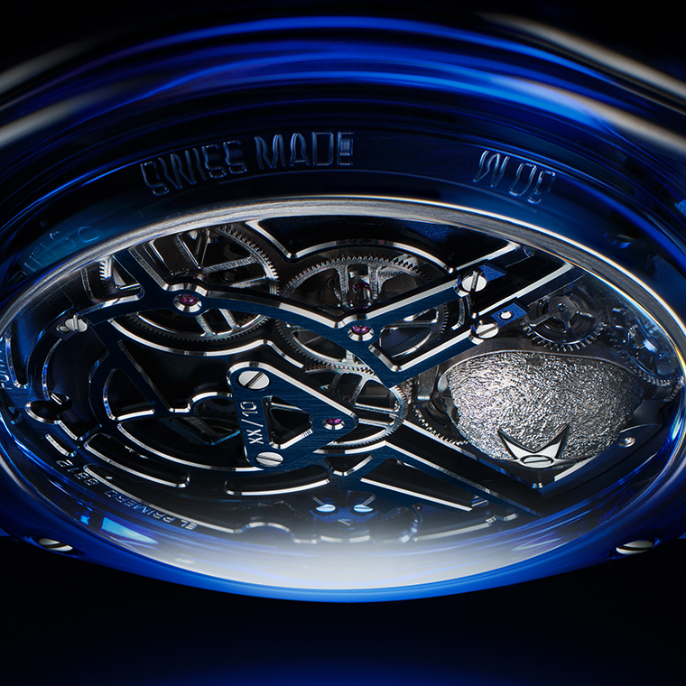 หัวใจของเรือนนี้คือเครื่อง El Primero 3600 รุ่นล่าสุดจากตำนานกลไกของแบรนด์ เดินด้วยความถี่ 5 เฮิรตซ์ (36,000 ครั้งต่อชั่วโมง) พร้อมชิ้นส่วนเอสเคปวีลซิลิคอน ทำให้เข็มโครโนกราฟหมุนรอบหน้าปัดในทุกๆ 10 วินาที บันทึกเวลาได้ละเอียดถึงเสี้ยววินาที มีกำลังลานสำรอง 60 ชั่วโมง และฟังก์ชันหยุดวินาทีเพื่อความเที่ยงตรงสูงสุด ฝาหลังแซฟไฟร์เผยให้เห็นโครงสร้างภายในอันงดงาม พร้อมคอลัมน์วีลสีน้ำเงิน คลัตช์แนวนอน และโรเตอร์โปร่งแต่งด้วยดาวสัญลักษณ์ของ Zenith