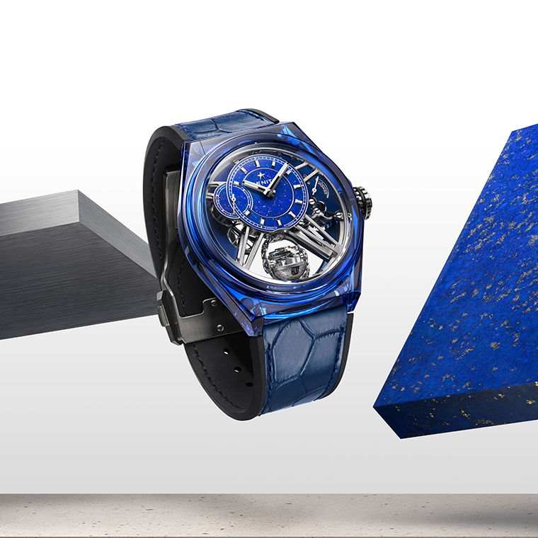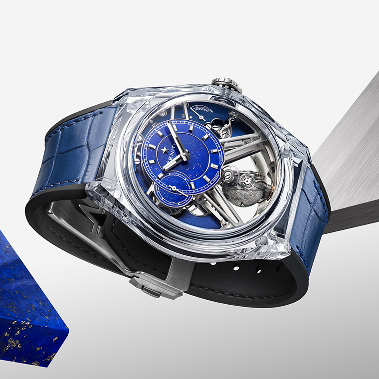 DEFY Zero G Sapphire Blue และ DEFY Zero G Sapphire Transparent ตัวเรือนขนาด 46 มิลลิเมตร ผลิตจากแซฟไฟร์ที่หล่อขึ้นจากบล็อกทั้งชุด หน้าปัดเยื้องศูนย์ตกแต่งด้วยหิน lapis lazuli สีน้ำเงินเข้มแต่งประกายทองจากไพไรต์ ให้ภาพเหมือนท้องฟ้ายามค่ำคืนที่เต็มไปด้วยดวงดาว และทำให้แต่ละเรือนมีเอกลักษณ์เฉพาะตัว มาพร้อมพลังงานสำรอง 50 ชั่วโมง ที่ตำแหน่ง 3 นาฬิกา กลไกแบบไขลานมือ El Primero 8812S แสดงโครงสร้างแบบโปร่งใส โดดเด่นด้วยสะพานกลไกทรงดาวที่สะท้อนเอกลักษณ์ของ ZENITH