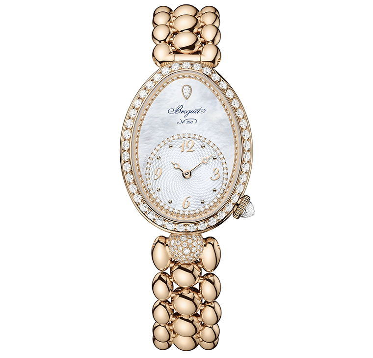 กรอบตัวเรือนประดับเพชรมากกว่าเดิม โดยเพิ่มจาก 37 เป็น 41 เม็ด ยกระดับคุณค่าความเป็นเครื่องประดับอัญมณีของคอลเลกชัน รุ่นนี้จับคู่กับสายนาฬิกาทอง ในแบบฉบับของ Bregue ที่ออกแบบให้รับกับข้อต่อตัวเรือนทรงกลม ณ ตำแหน่งหกนาฬิกา และเป็นครั้งแรกที่มีการประดับเพชรด้วยเทคนิค snow-setting