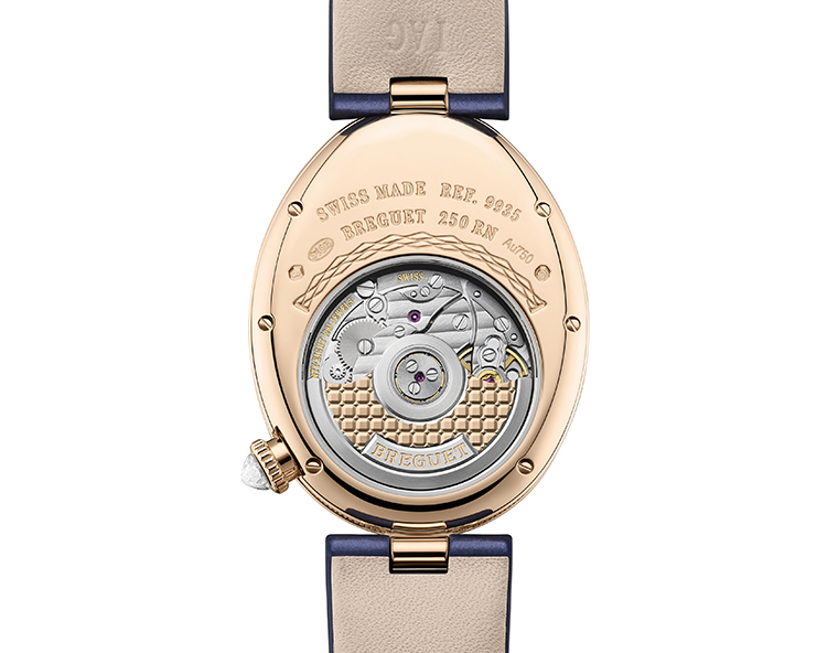 ด้านหลังของเรือนเวลาเผยให้เห็นความพิเศษเฉพาะรุ่นด้วยคำสลัก “BREGUET 250 YEARS” บนกระจกคริสตัลแซฟไฟร์ซึ่งเผยให้เห็นโรเตอร์ทาจากแพลทินัม 950 ประดับด้วยลวดลายปิดทองอย่างประณีตด้วยเทคนิค Breguet gilding