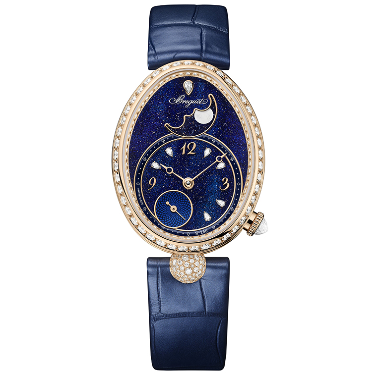ดวงจันทร์บนหน้าปัดมีลักษณะเป็นโดมโค้งเล็กน้อย รังสรรค์จากมุก mother-of-pearl สีขาว ประดับอยู่บนแผ่นดิสก์แก้วอะเวนทูรีนสีน้ำเงิน ขับให้ดวงจันทร์แลดูสว่างโดดเด่นยิ่งขึ้น ซึ่งนับเป็นครั้งแรกในคอลเลกชัน Reinede Naples เช่นกัน นอกจากนี้ยังมีลายเซ็นลับของ Breguet อีกด้วย ส่วนเหล่าดวงดาวที่ล่องลอยอยู่บนพื้นผิวโปร่งใสเปล่งประกายสีขาวเหลือบมุก จากแผ่นเปลือกหอยมุก ซึ่งจะมีเพียงสุภาพสตรีผู้สวมใส่นาฬิกาเรือนนี้เท่านั้น ที่จะได้ชื่นชมความงดงามนี้ เมื่อตั้งใจสังเกตอย่างละเอียด
